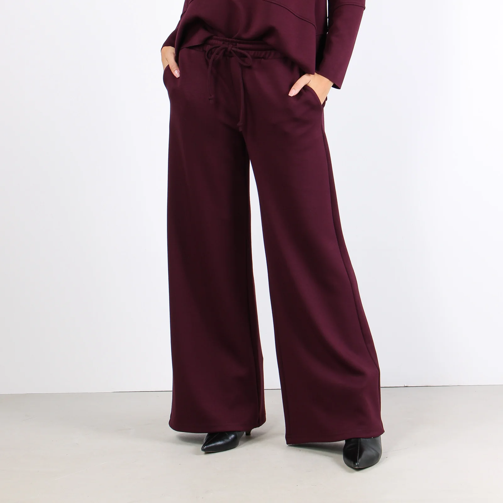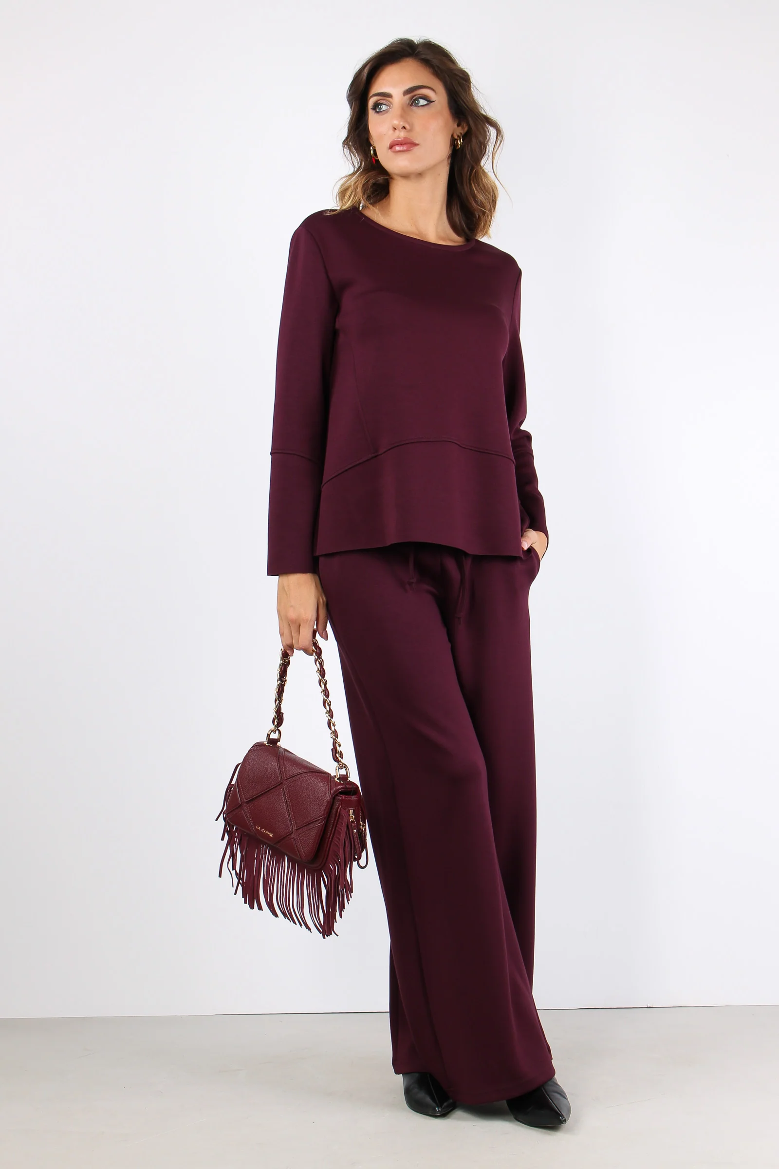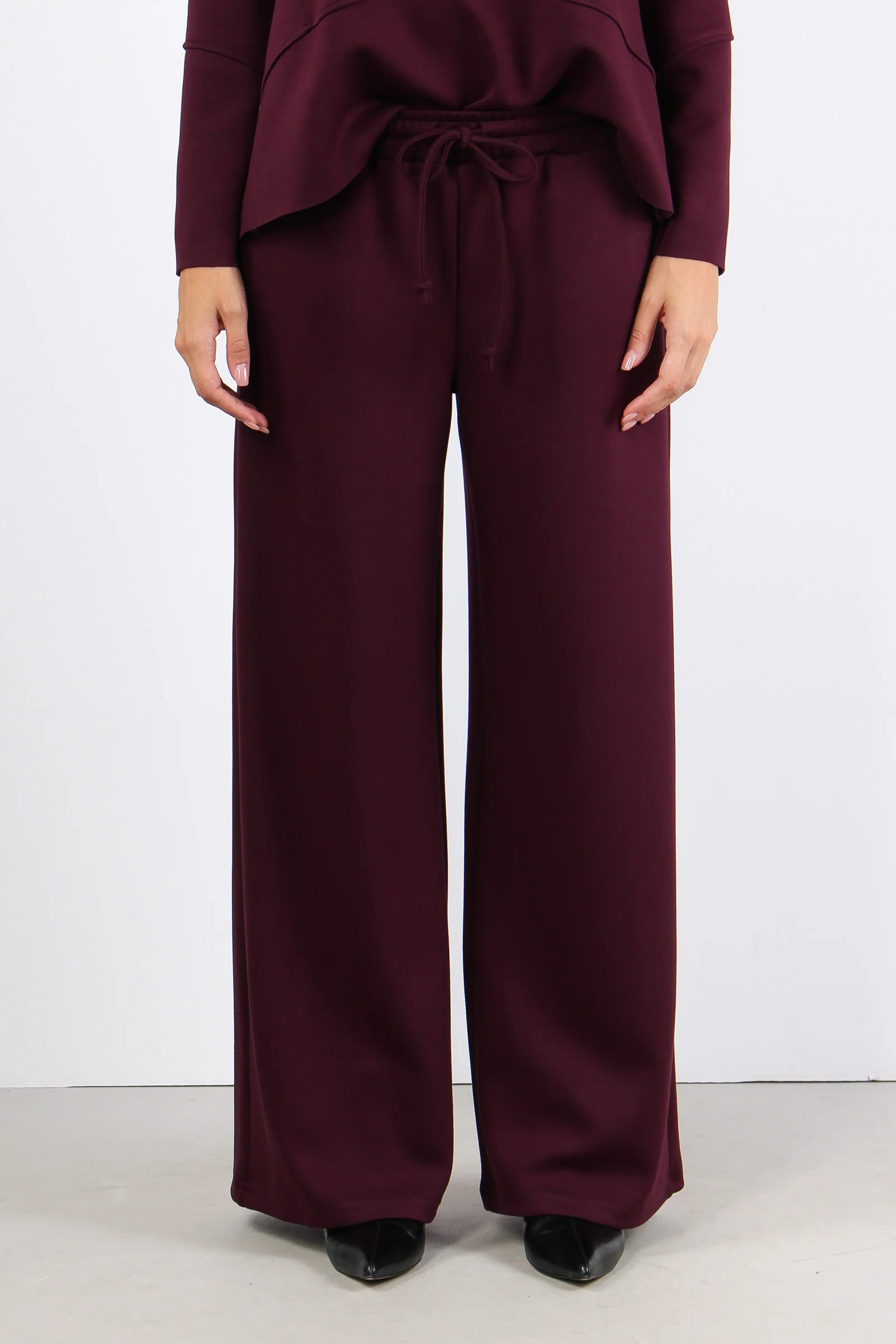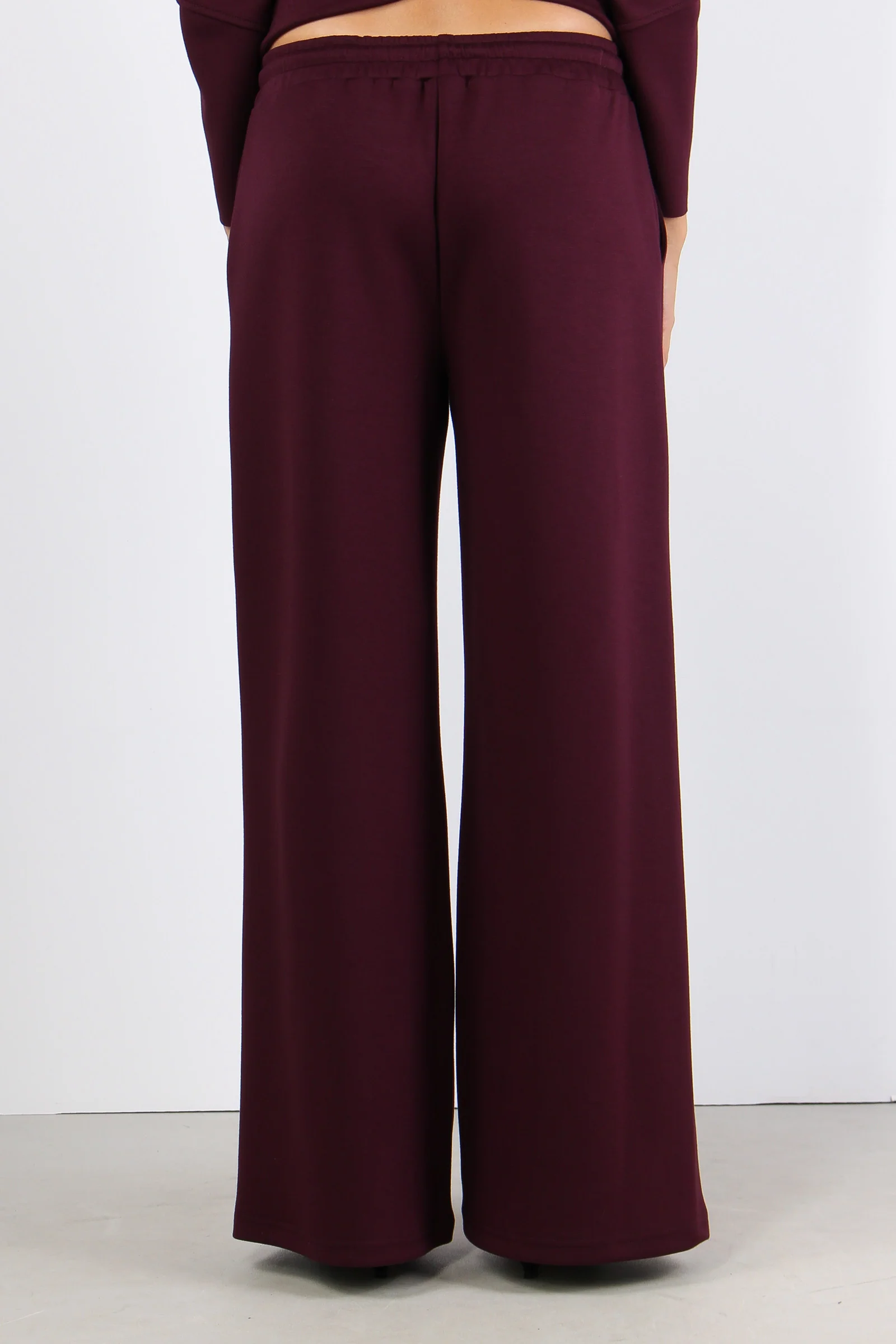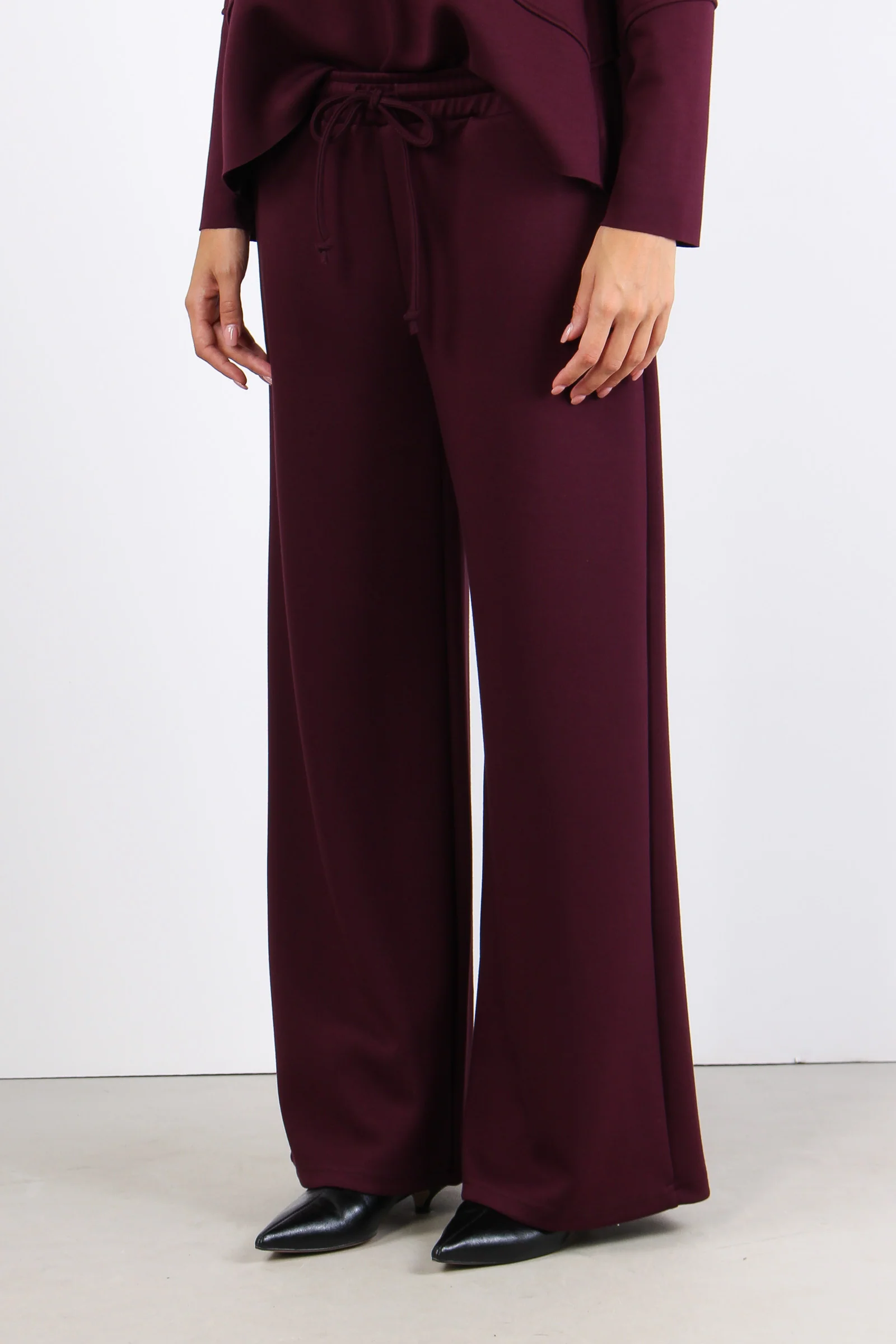 Pantalone palazzo con coulisse in vita color vino. In tessuto elasticizzato e molto morbido. L’ideale per i tuoi outfit quotidiani. Composizione articolo: 50% poliestere 46% viscosa 4% elastan La modella è alta 1 75 e indossa una tg. S.