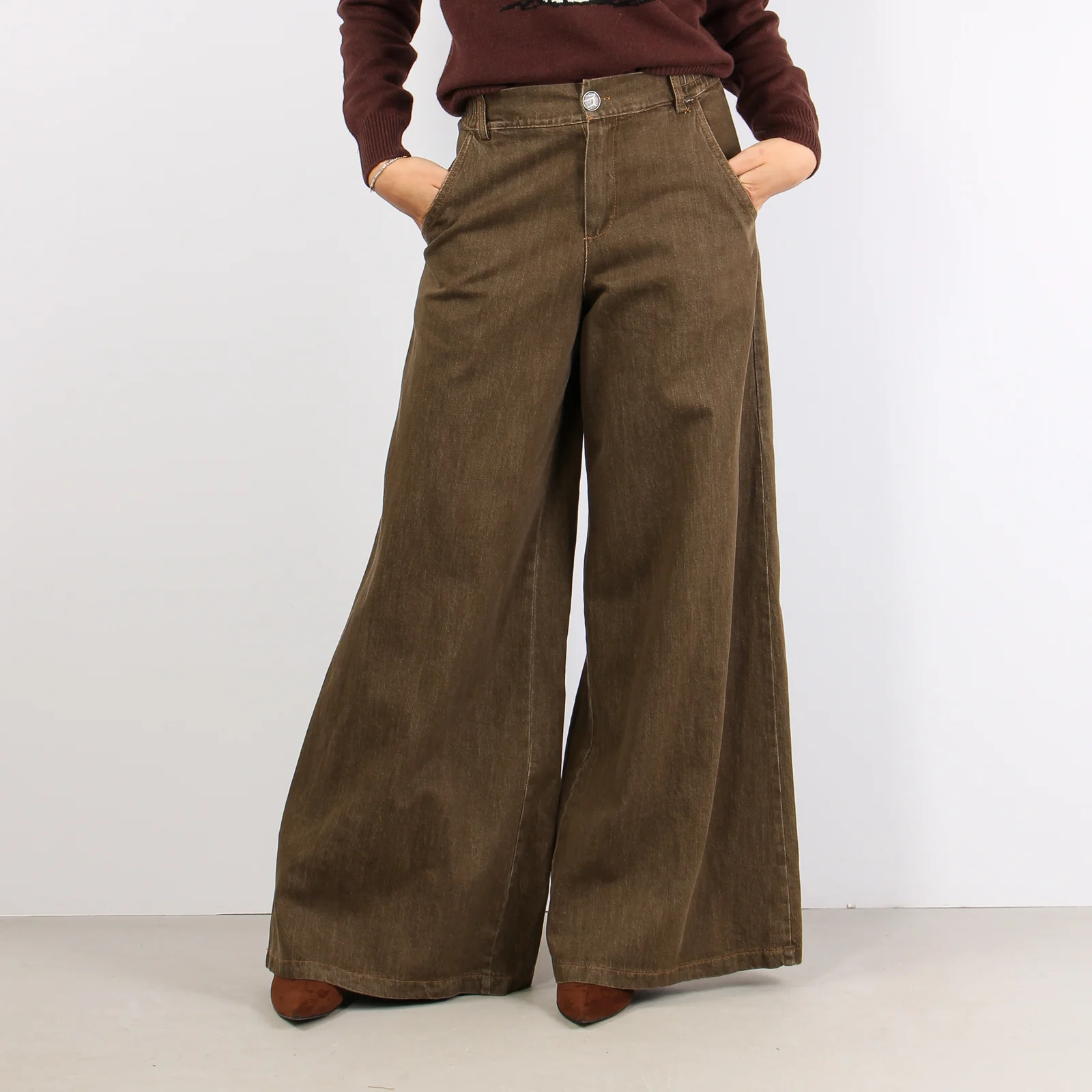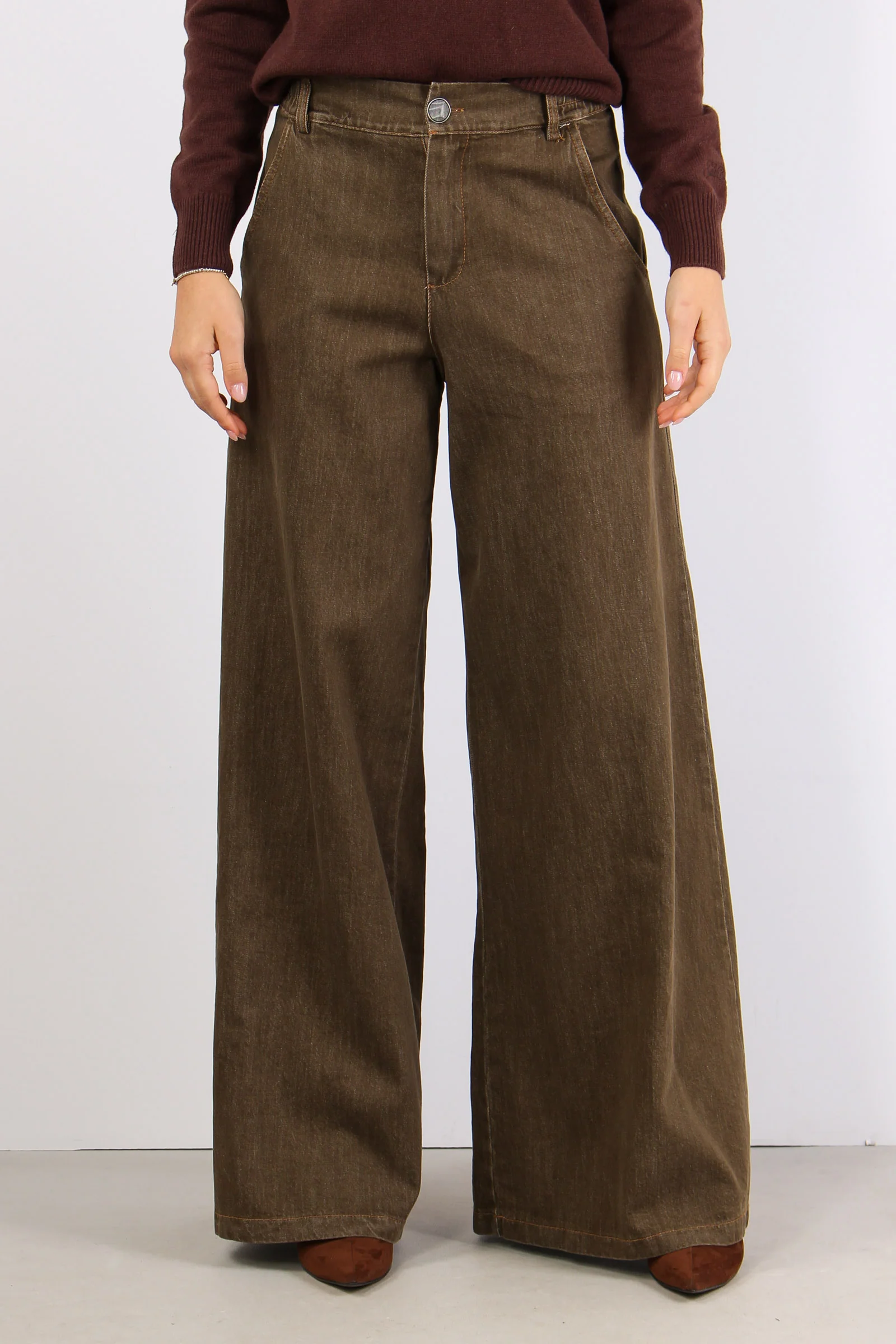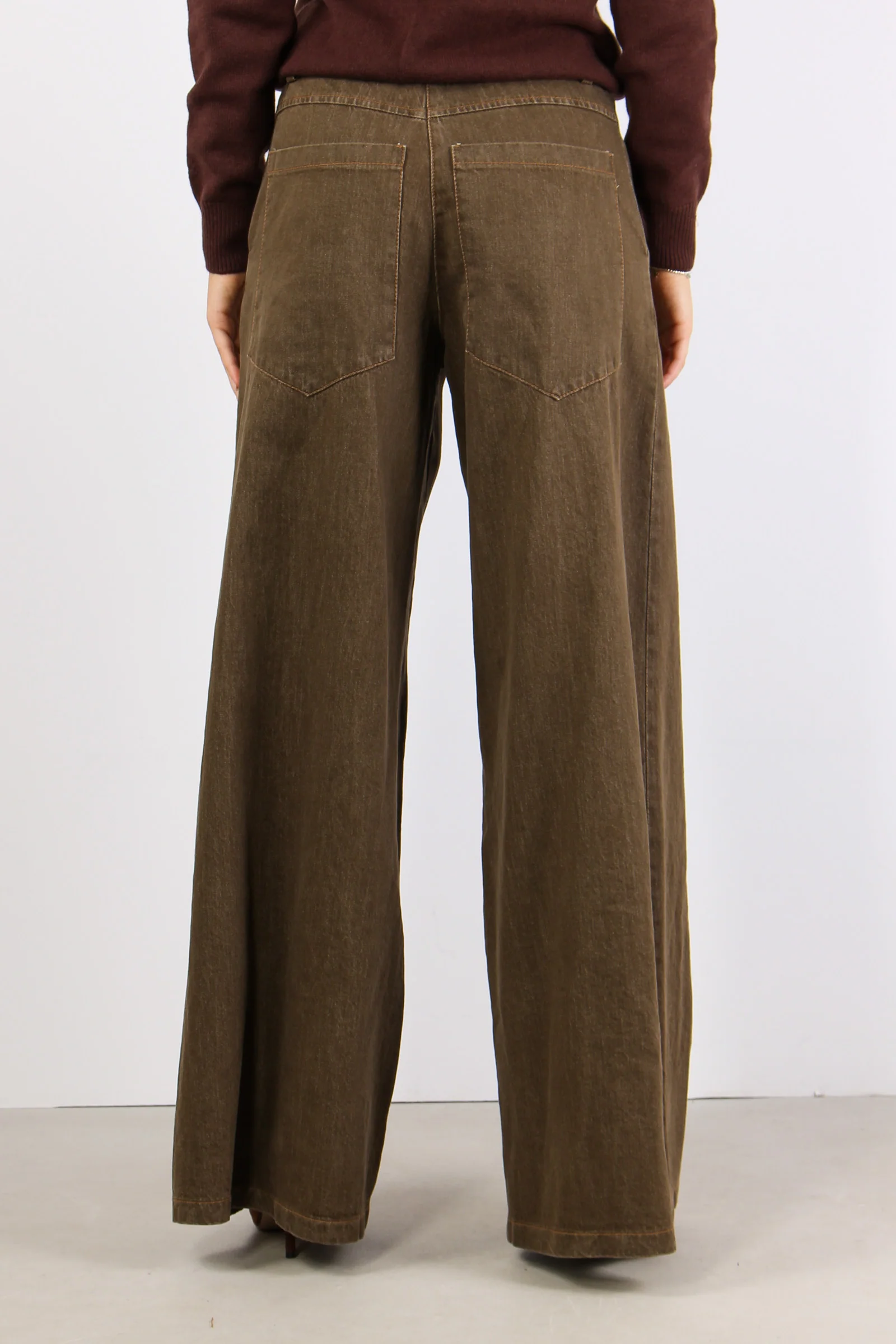 Pantalone palazzo in tessuto effetto denim slavato. Cuciture a contrasto elastico in vita con passanti. Maxi tasche sul retro. Composizione articolo: 99% cotone 1% elastan La modella è alta 1 75 e indossa una tg. S.