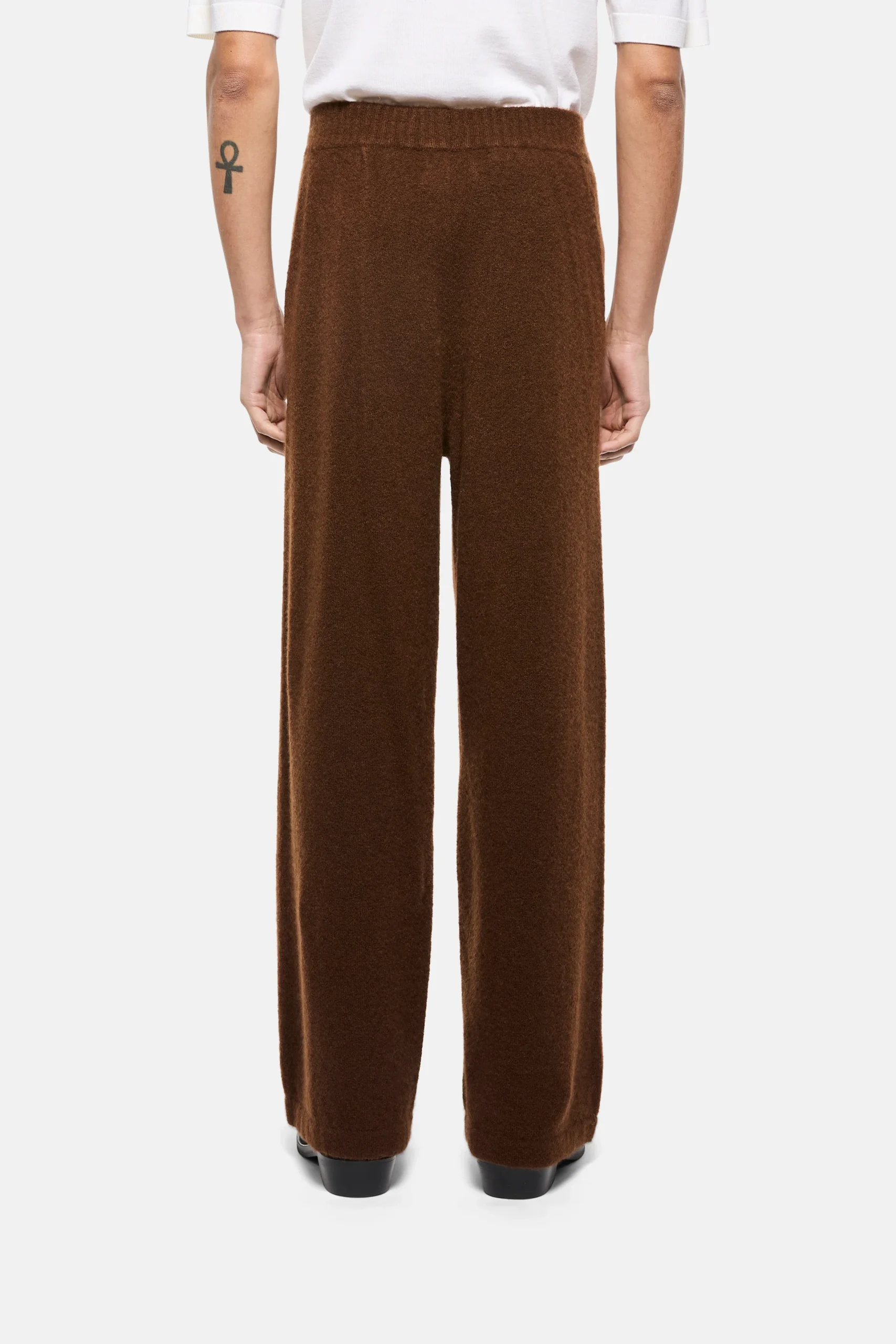 Pantalone in maglia firmato Laneus, realizzato in cashmere e seta lavorato in rasato, che garantisce una texture estremamente morbida. Il modello presenta una vestibilitร regular, con tasche laterali inserite in cucitura e fondo ampio che dona fluiditร e movimento alla silhouette. Ideale per un look sofisticato e rilassato. Made in Italy.