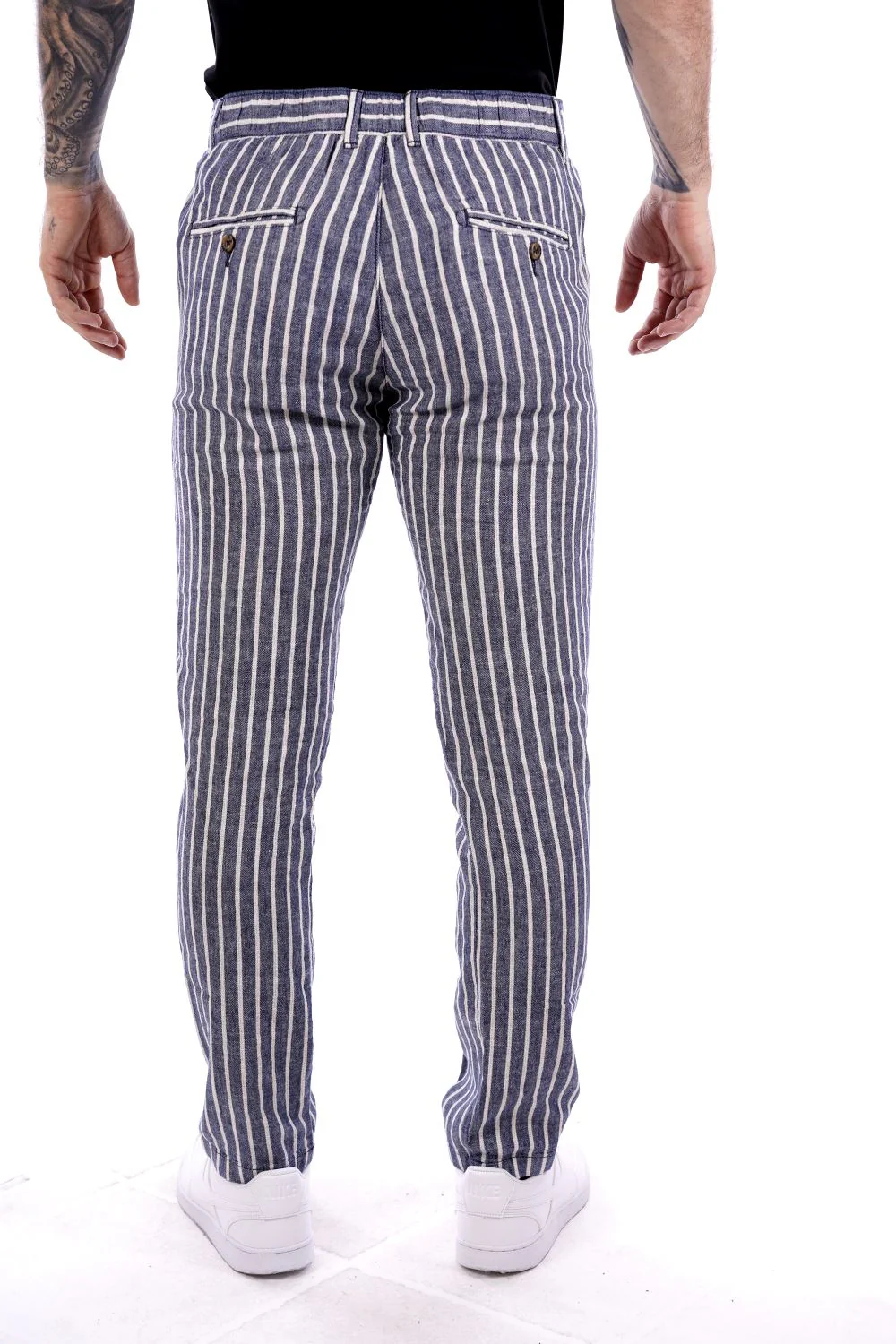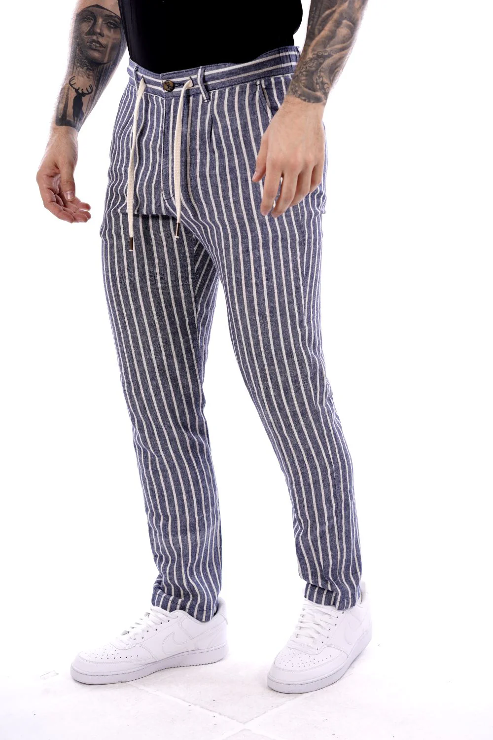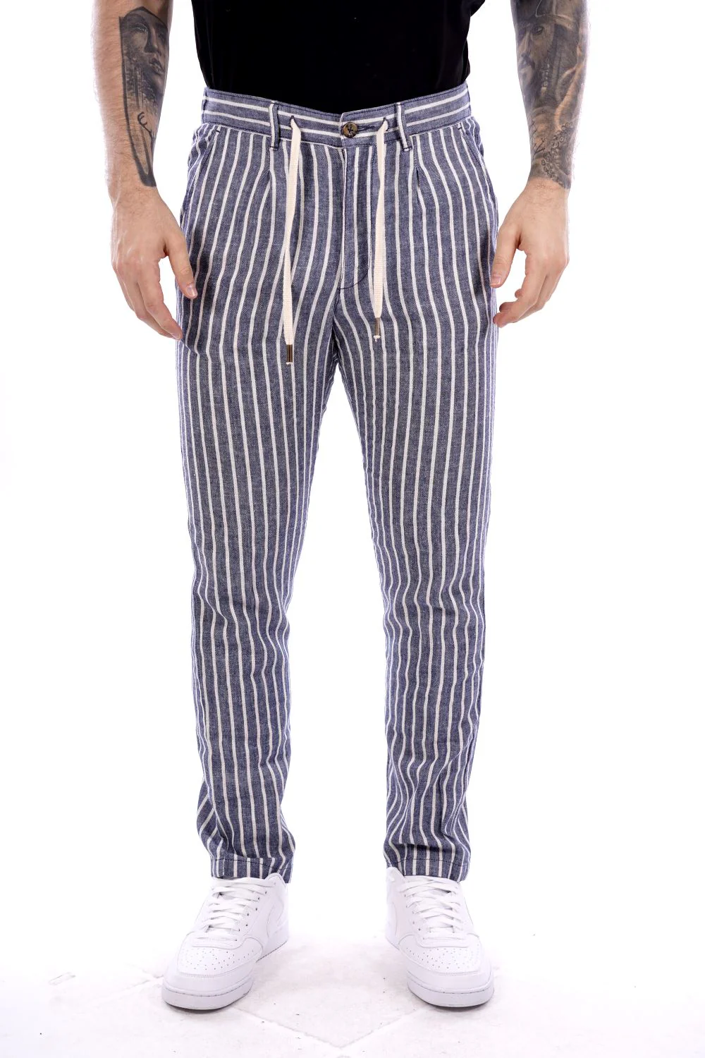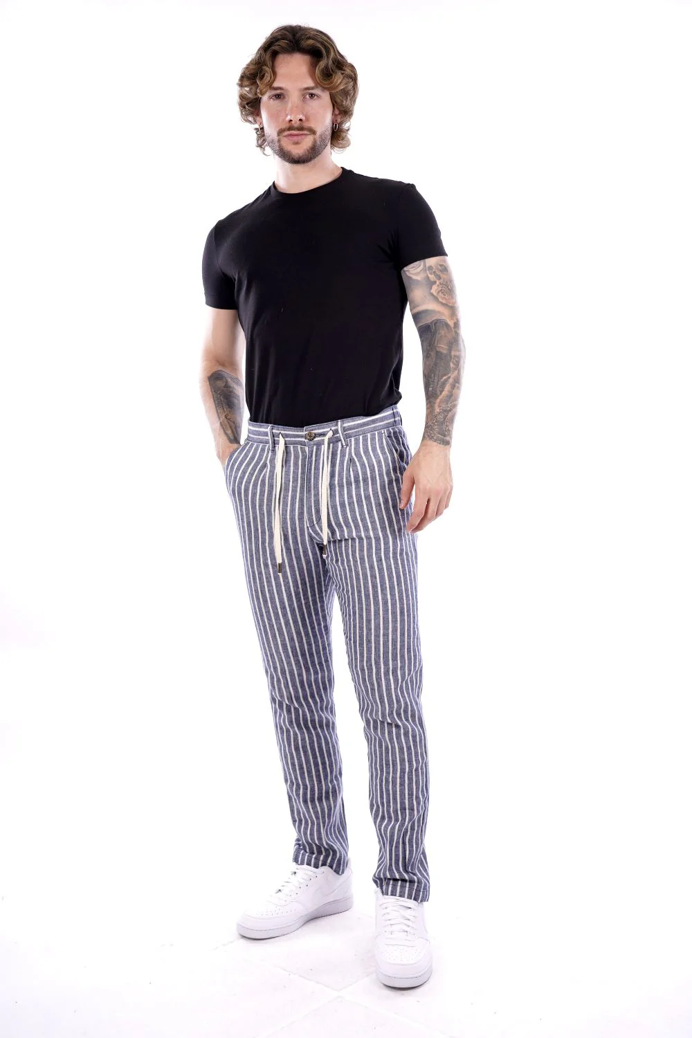 PHILO TINTO Pantalone blu da uomo in misto lino/cotone . Modello gessato con coulisse in vita , chiusuta con bottone e quattro tasche