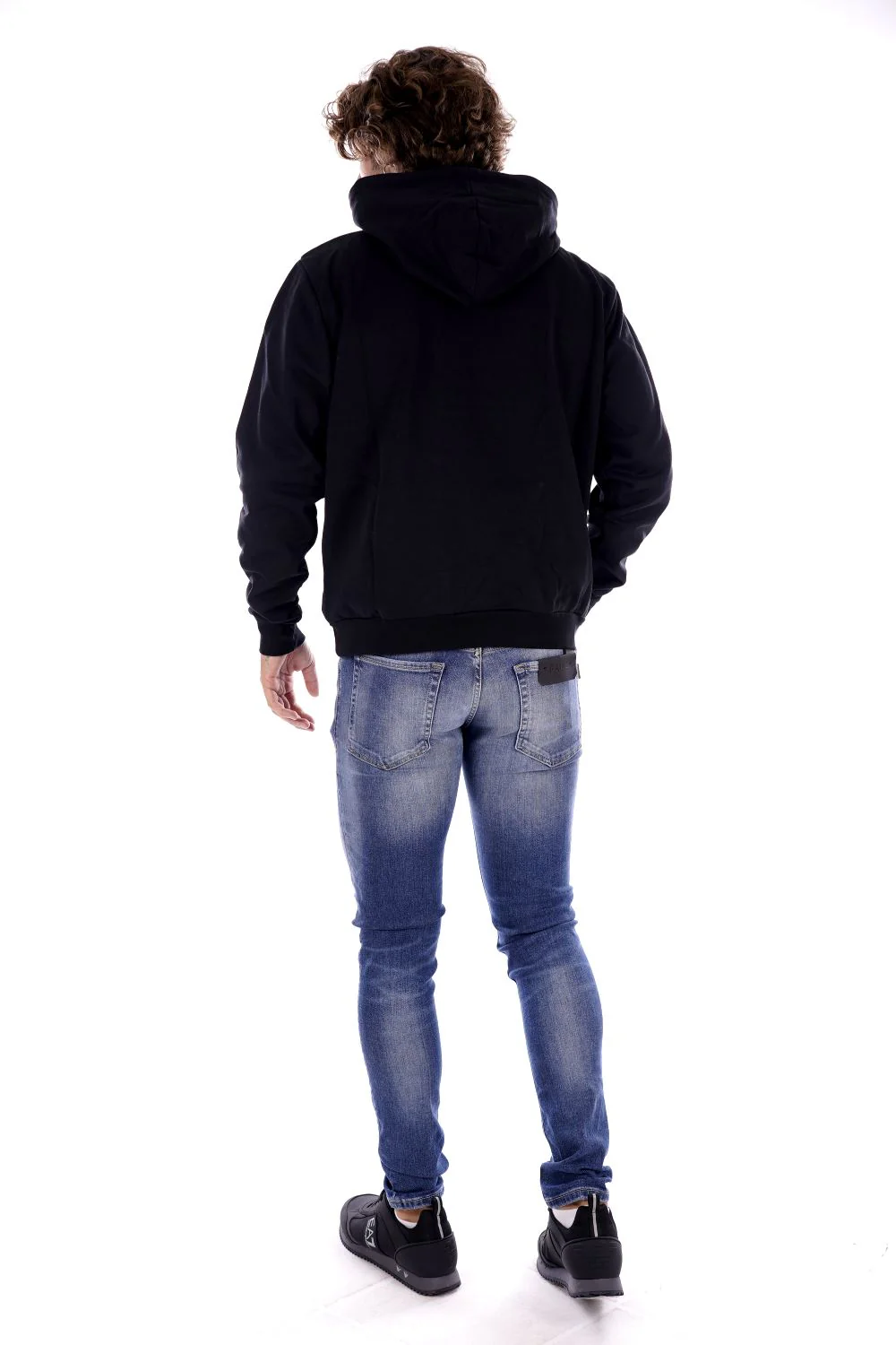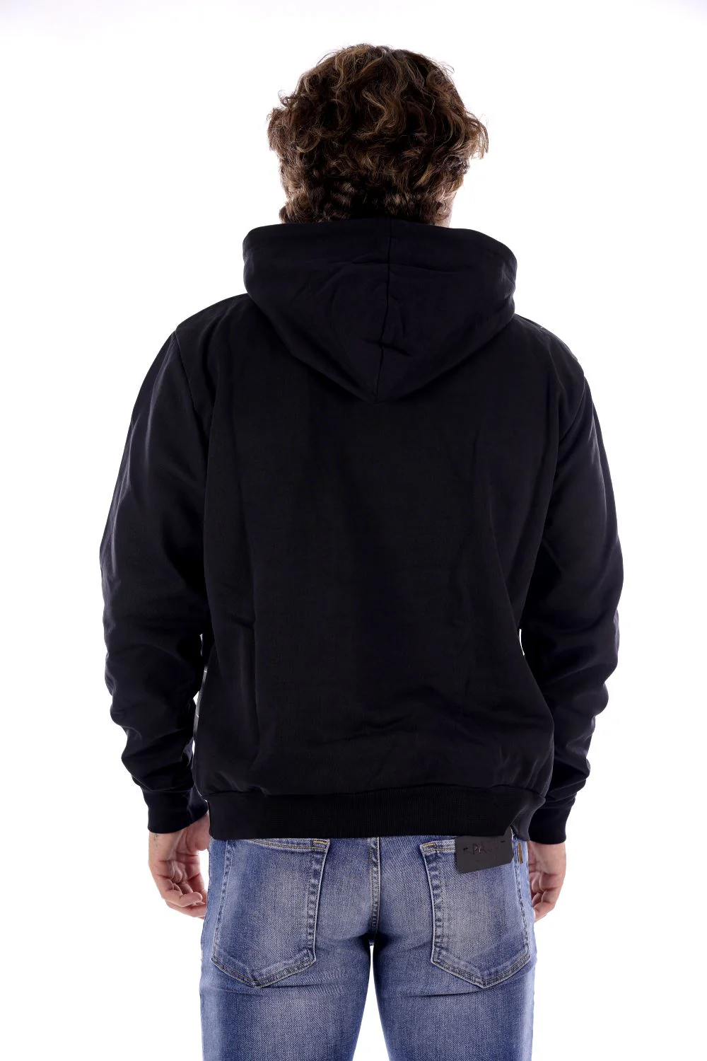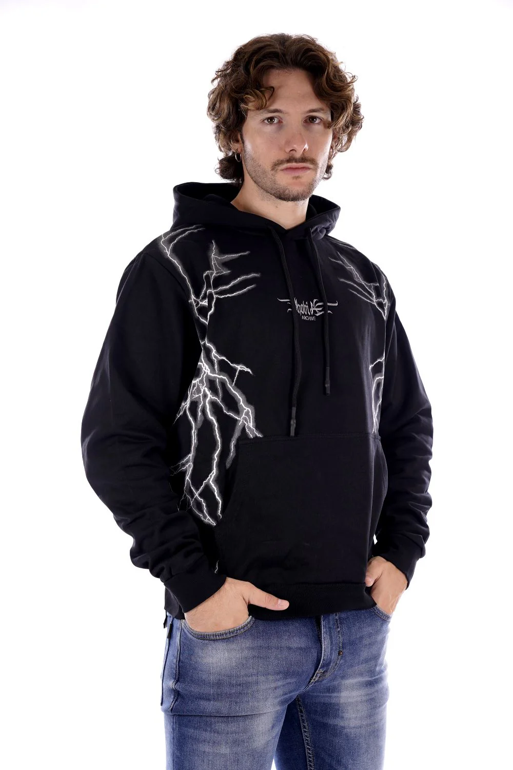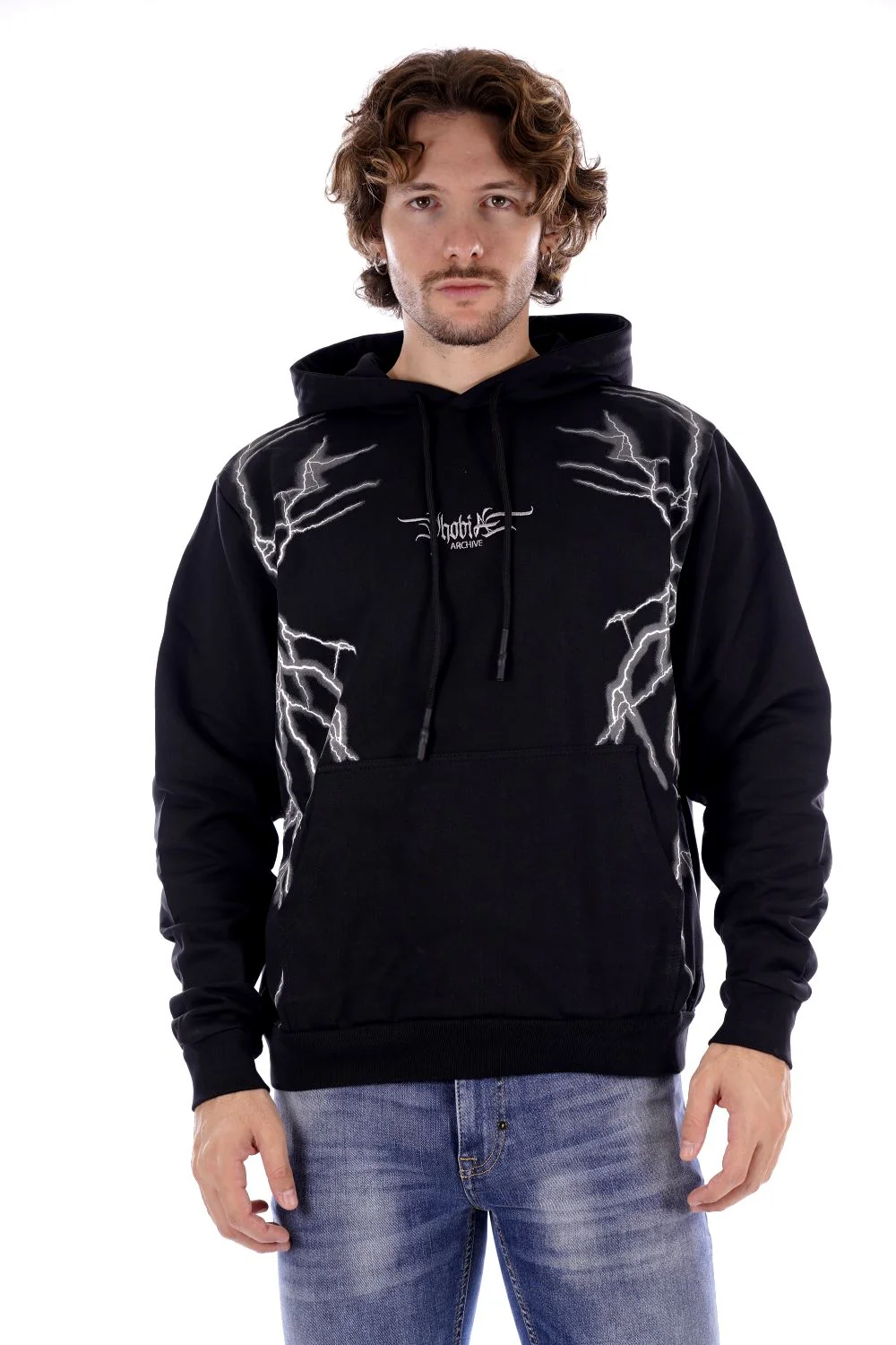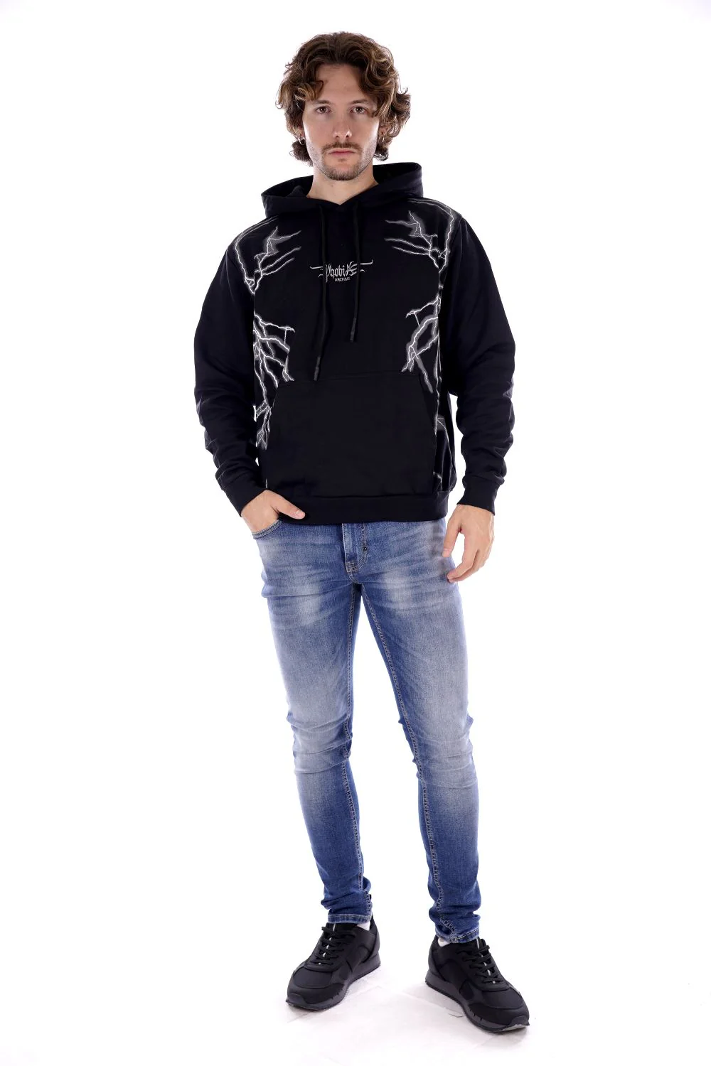 PHOBIA Felpa nera per uomo , chiusa con cappuccio , in cotone , con fulmini grigi . Ricamo gotico sul petto
