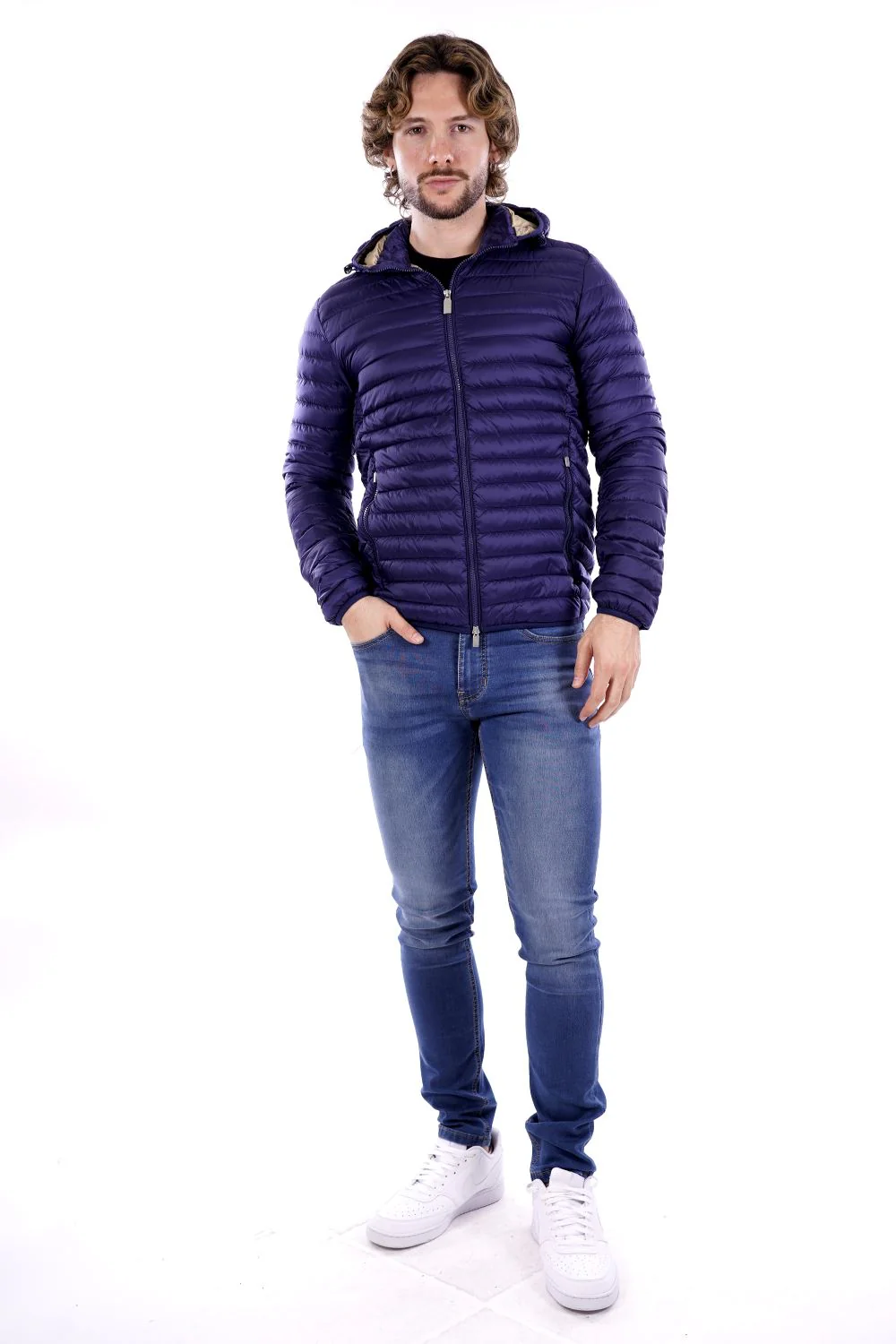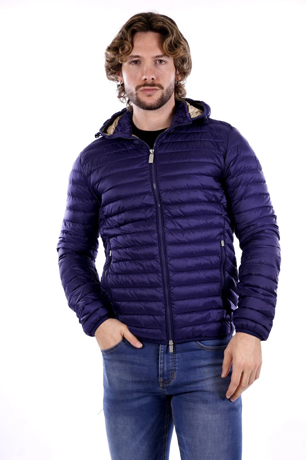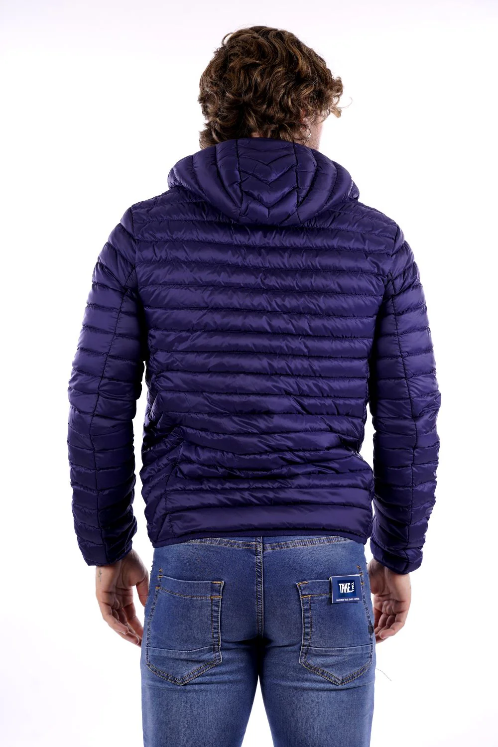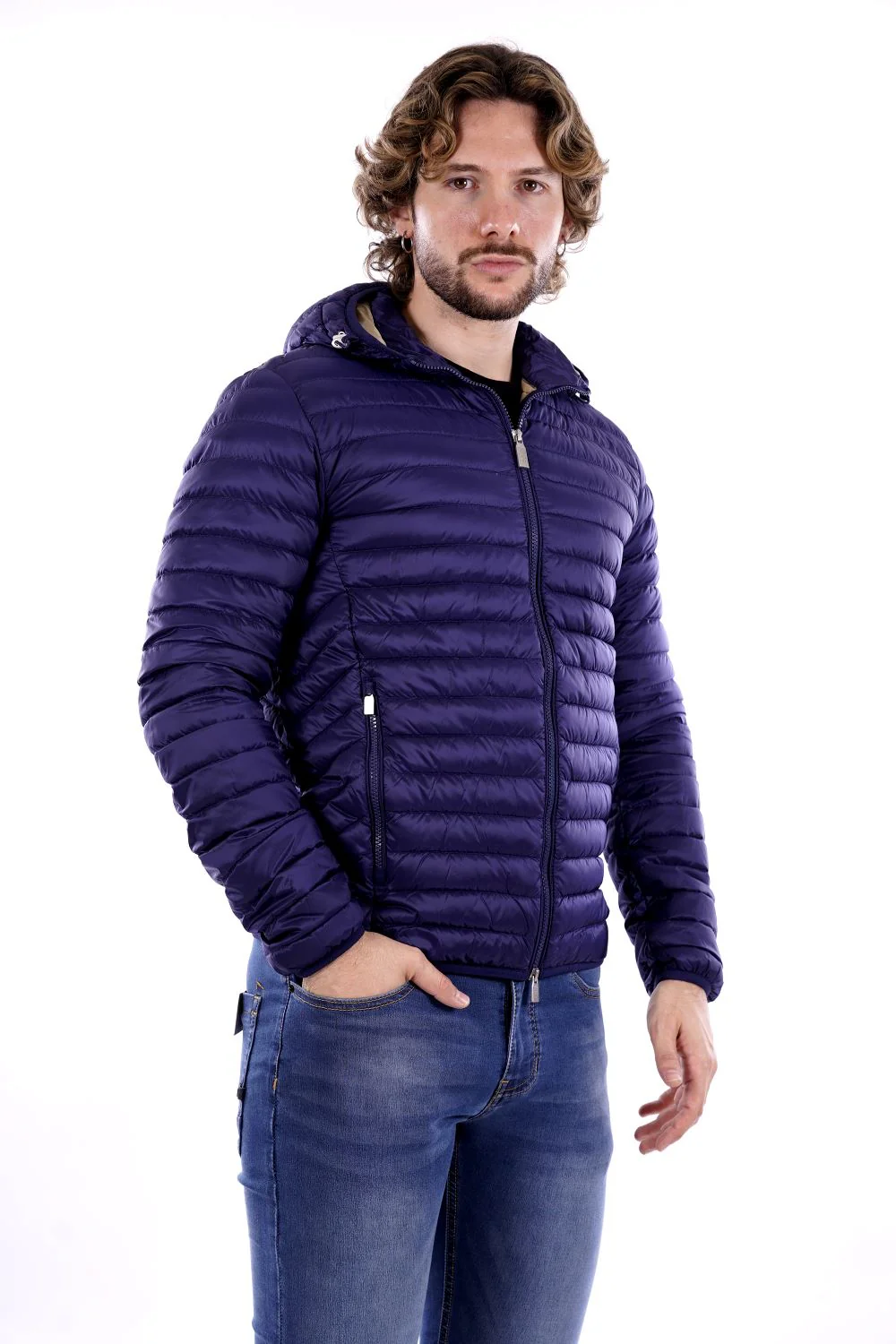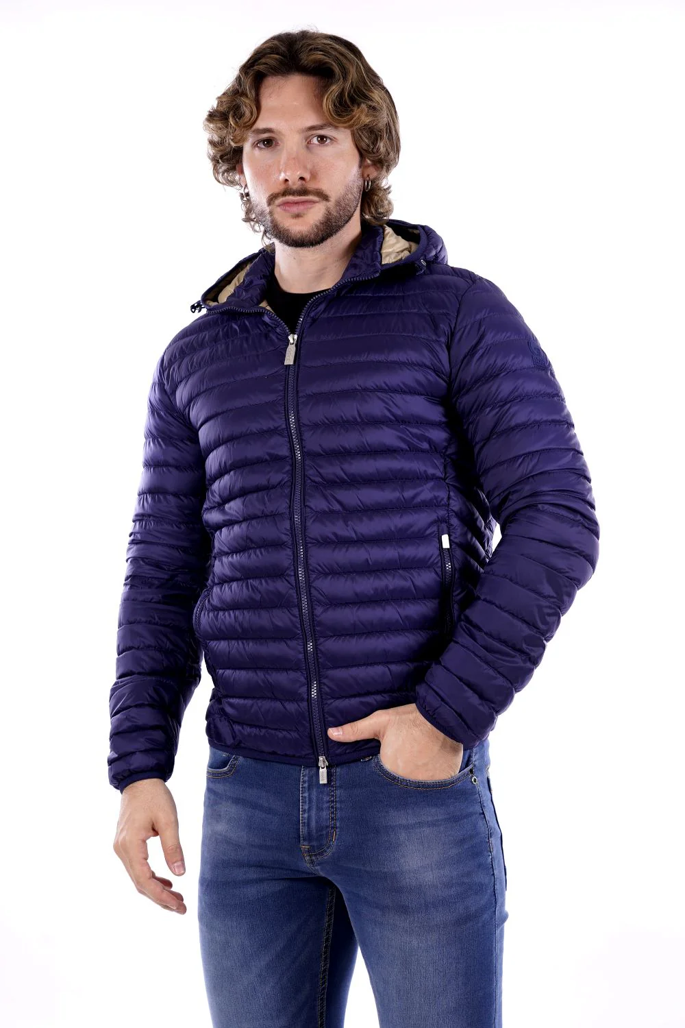 CIESSE PIUMINI Piumino blu da uomo in tessuto tecnico . Modello trapuntato a canale con cappuccio , chiusura con lampo e due tasche . Logo CIESSE tono su tono sulla spalla sinistra