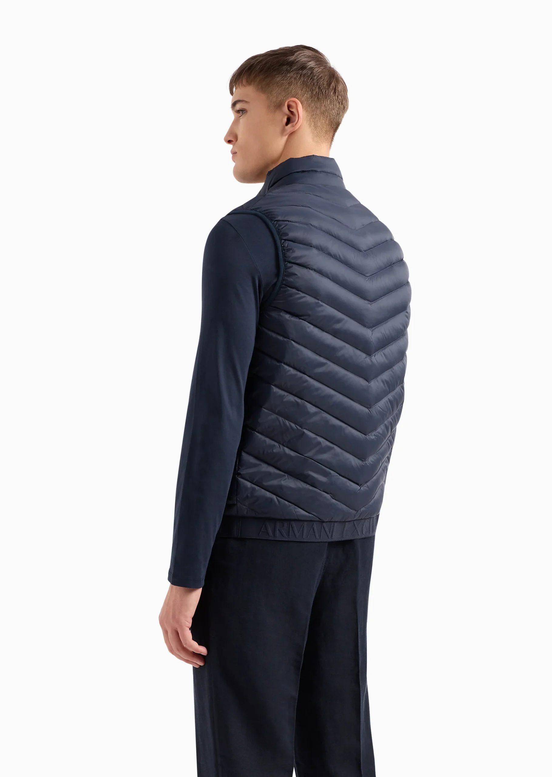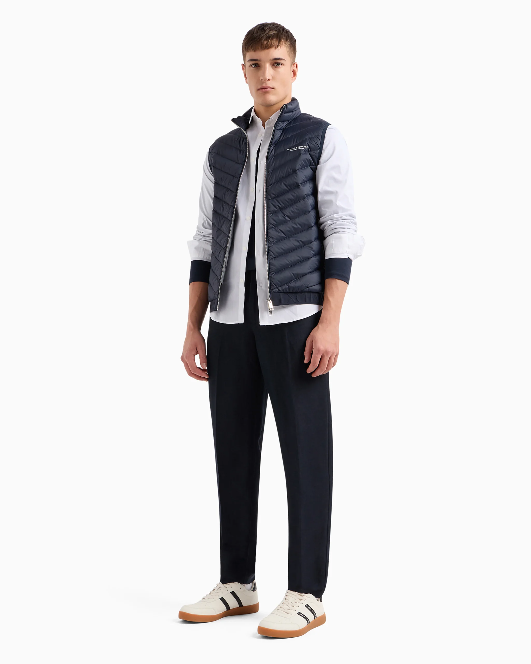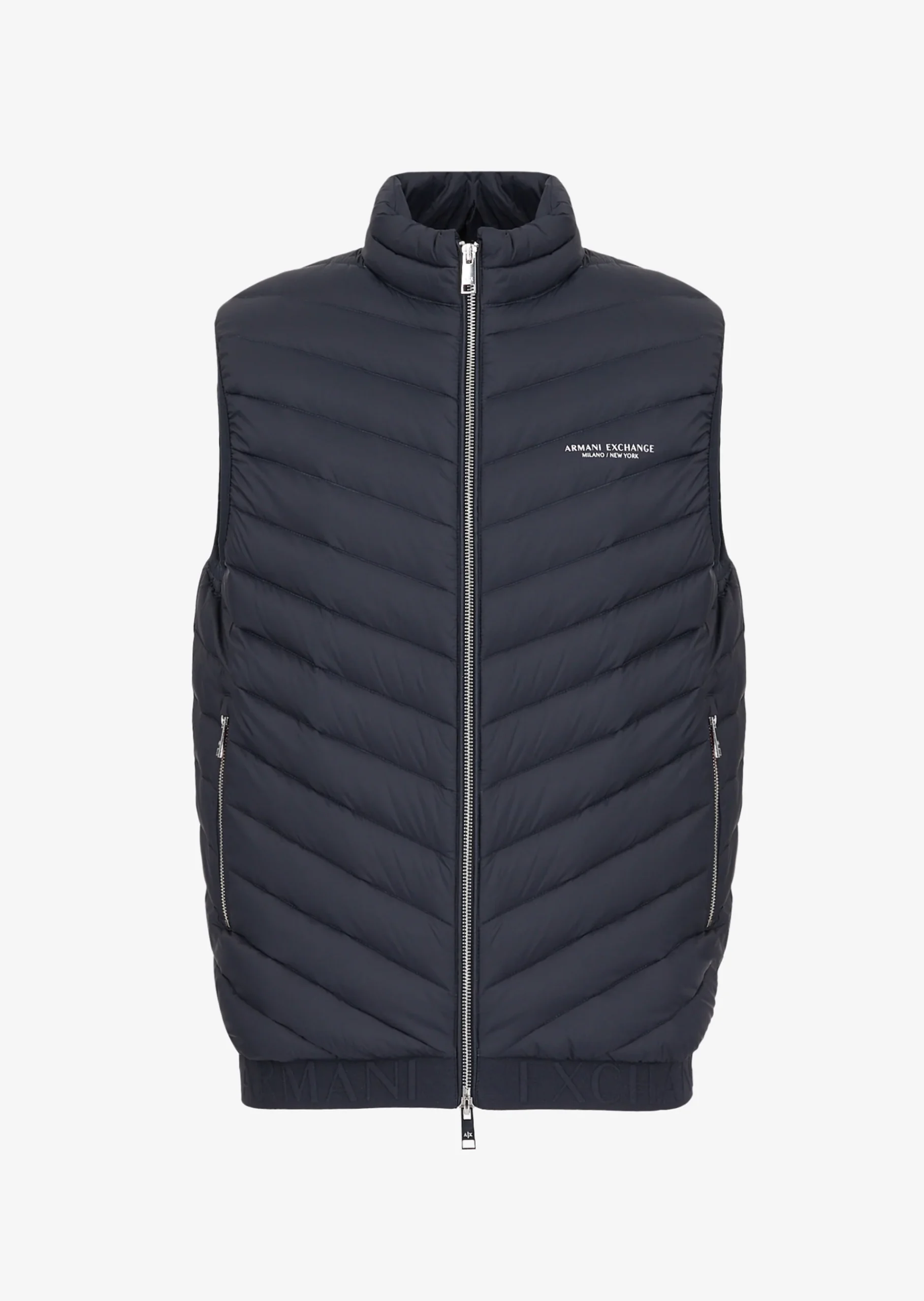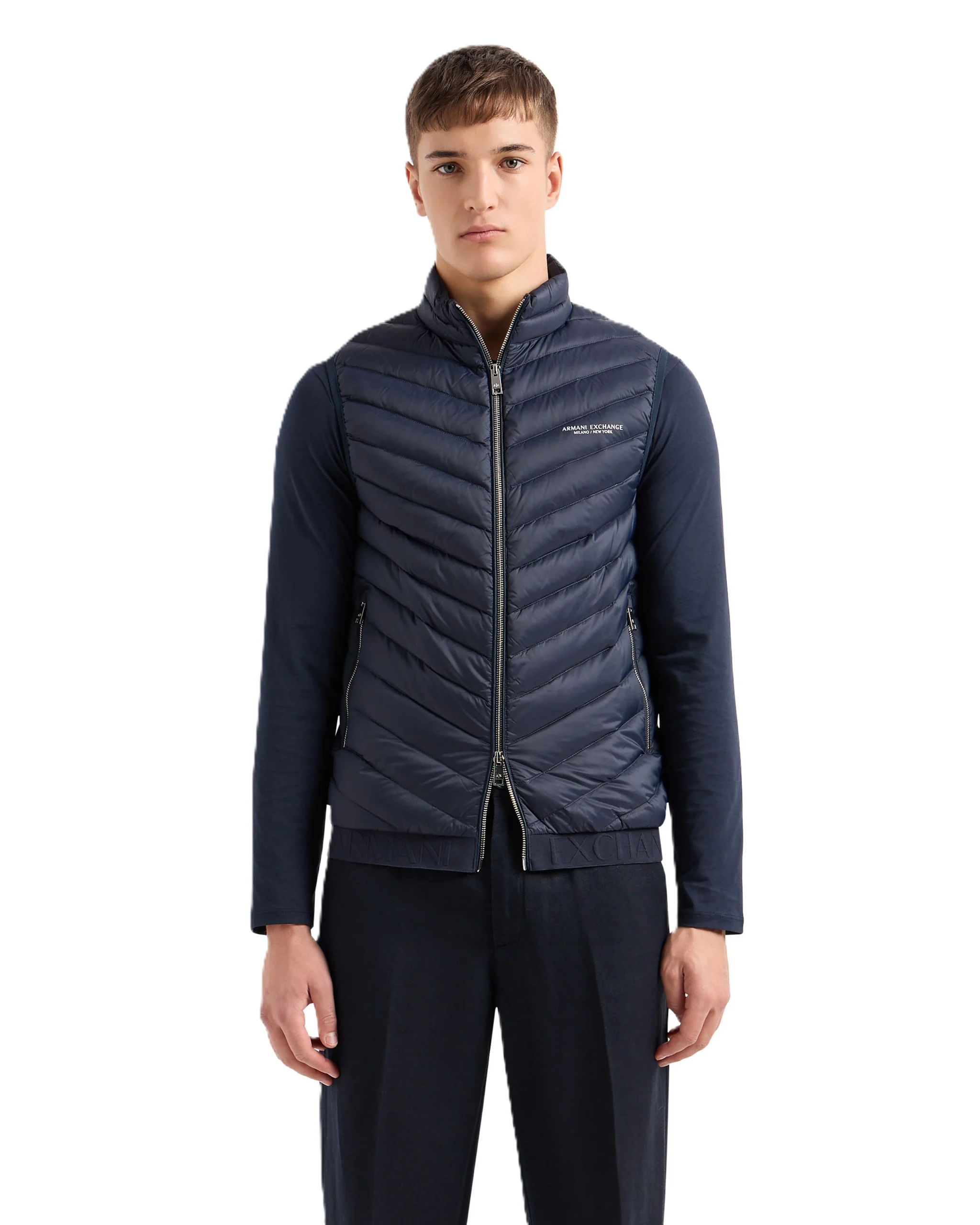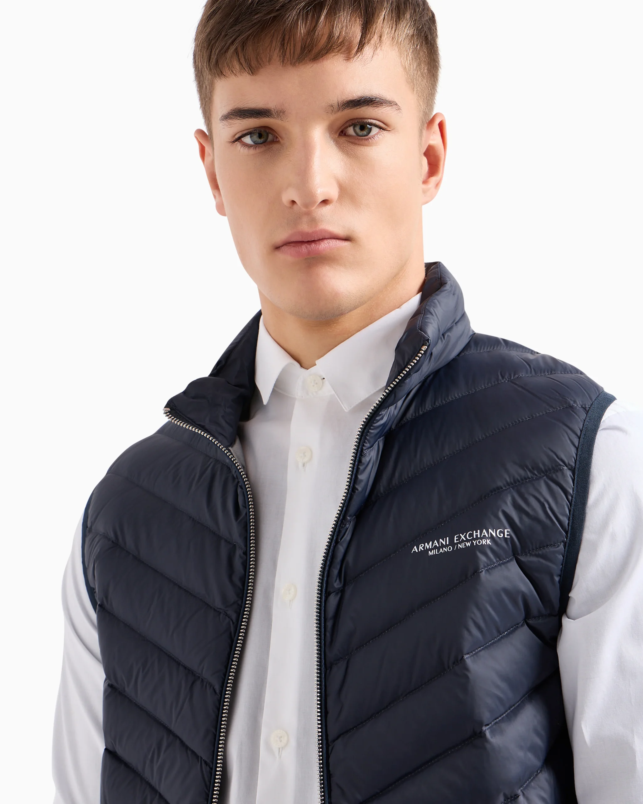 ARMANI EXCHANGE Piumino smanicato leggero blu da uomo . Esterno in nylon . Imbottitura leggera in piuma . Modello trapuntato con collo alto , due tasche , fondo con elastico e chiusura a zip . Logo ARMANI sul petto