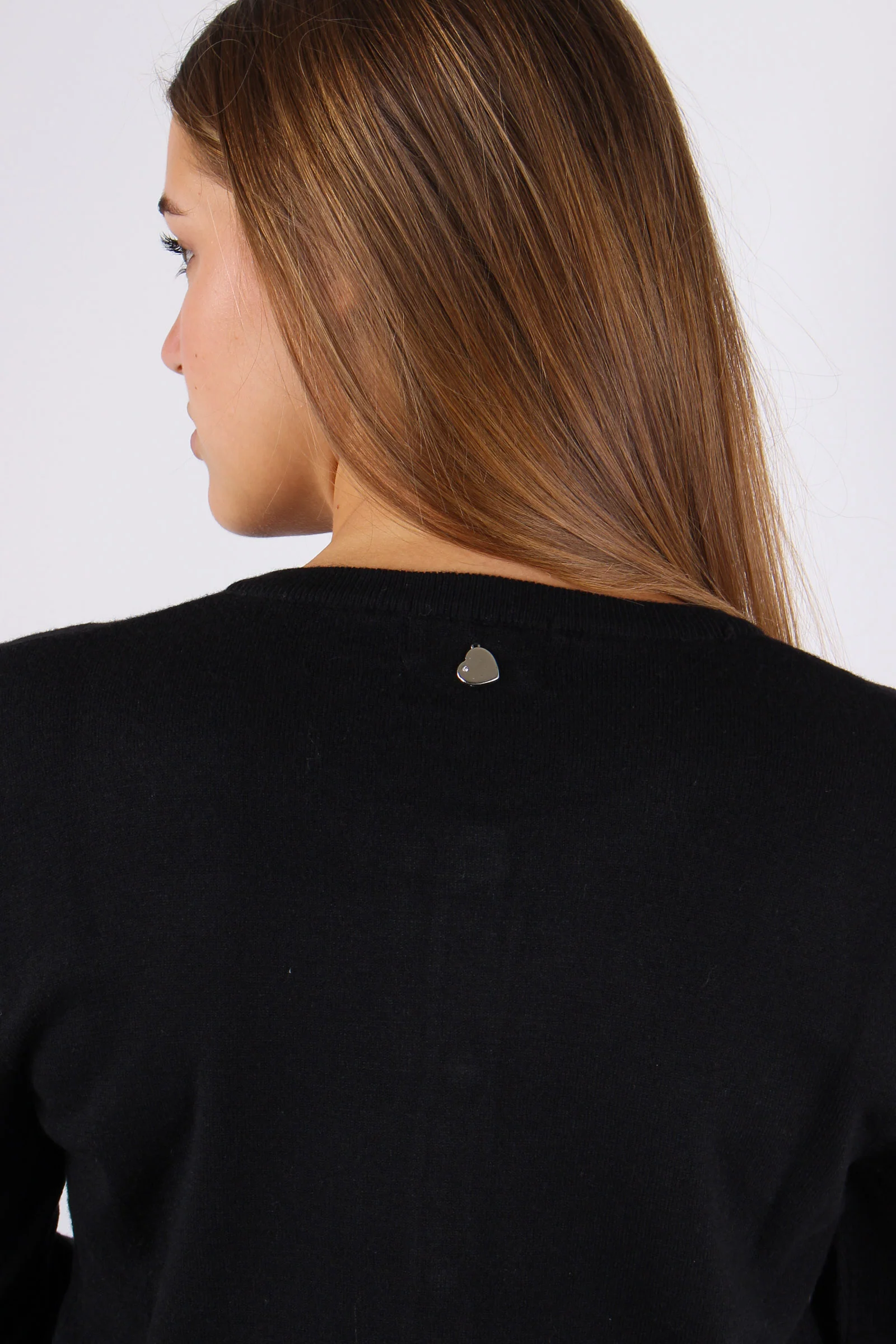 Rebecchina in misto viscosa girocollo a manica lunga. Il basic che non può di certo mancare nel nostro armadio. Vestibilità regolare. Impreziosita dalla medaglietta a cuore con micro strass applicata dietro al collo. Composizione articolo: 51% viscosa 26% poliestere 23% poliammide La model