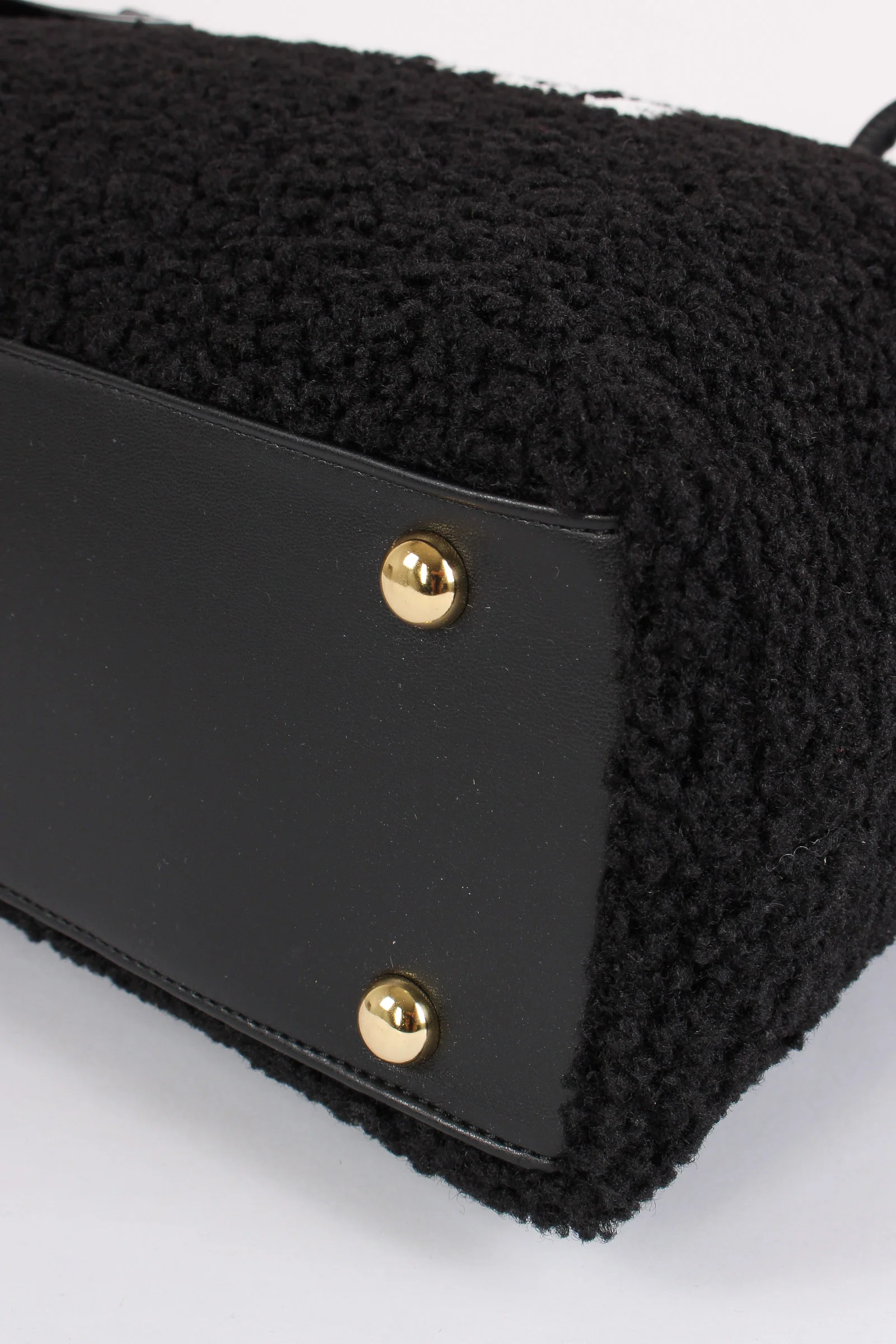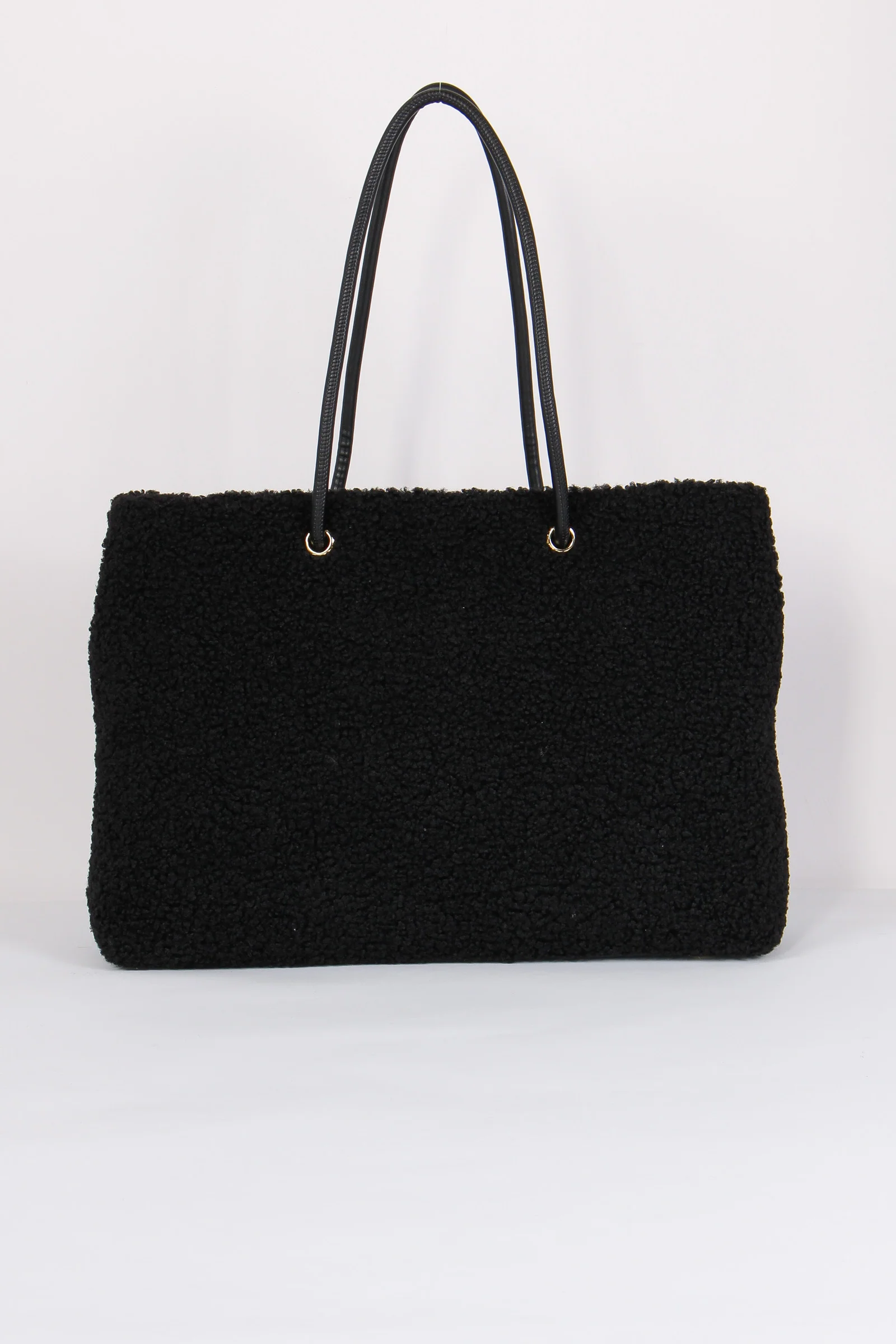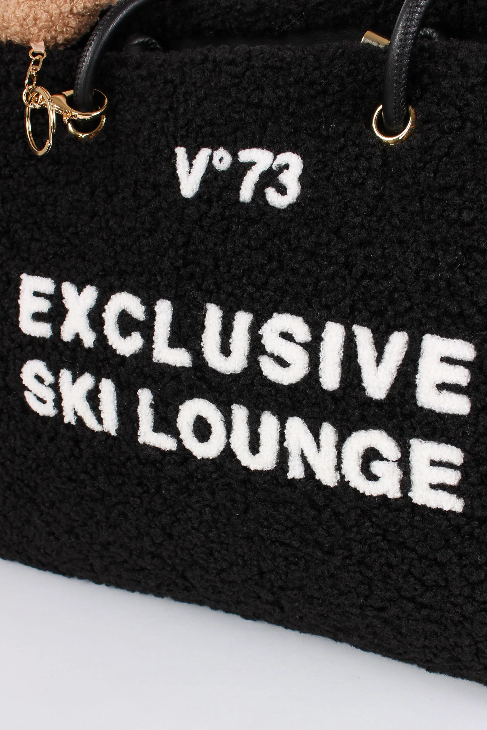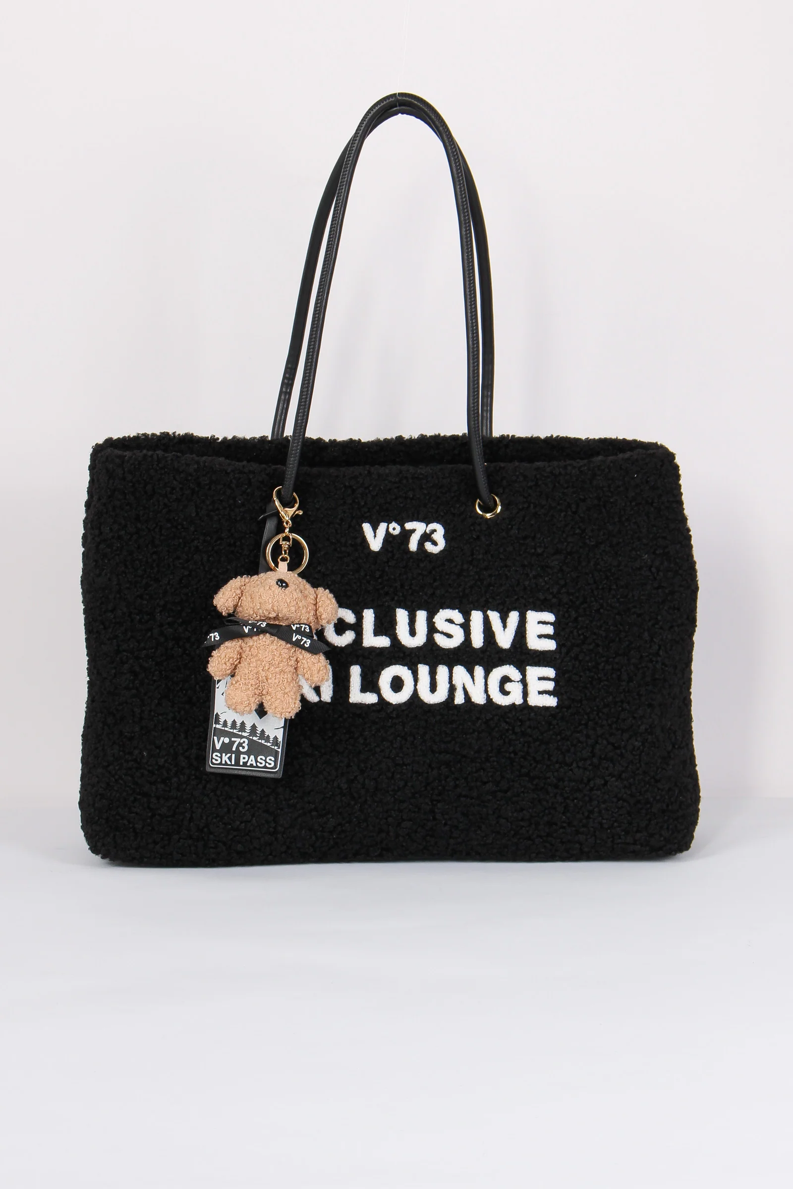 Materiale: 90% poliestere e 10% poliuretano fodera 100% poliestere. chiusura: zip tracolla: no dettagli: Shopping in teddy con logo frontale manici con nodo e fondo in metallo. Orsetto removibile con ski pass. Interno foderato porta oggetti. Misure: Altezza 30cm lunghezza 40cm e profondità 11