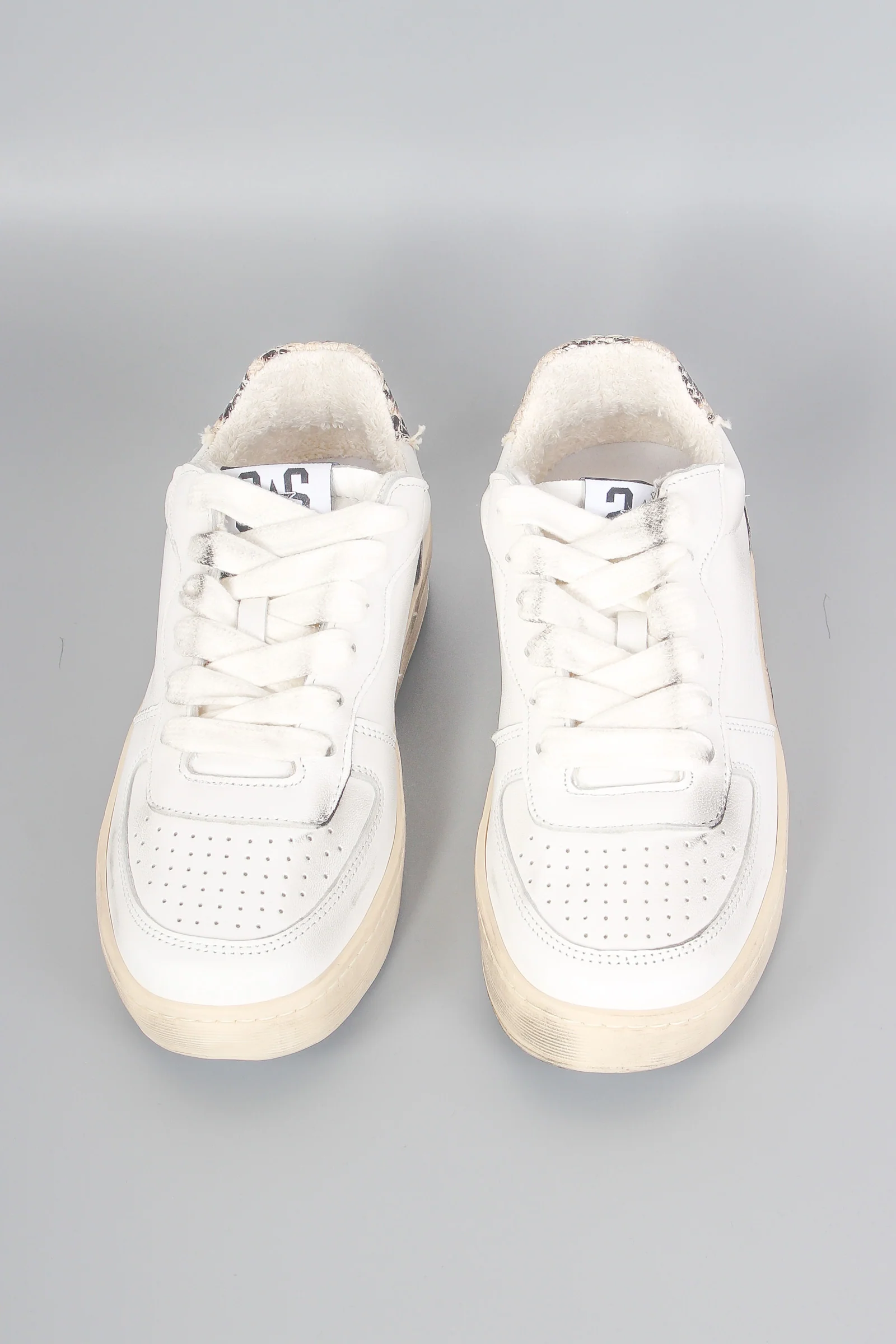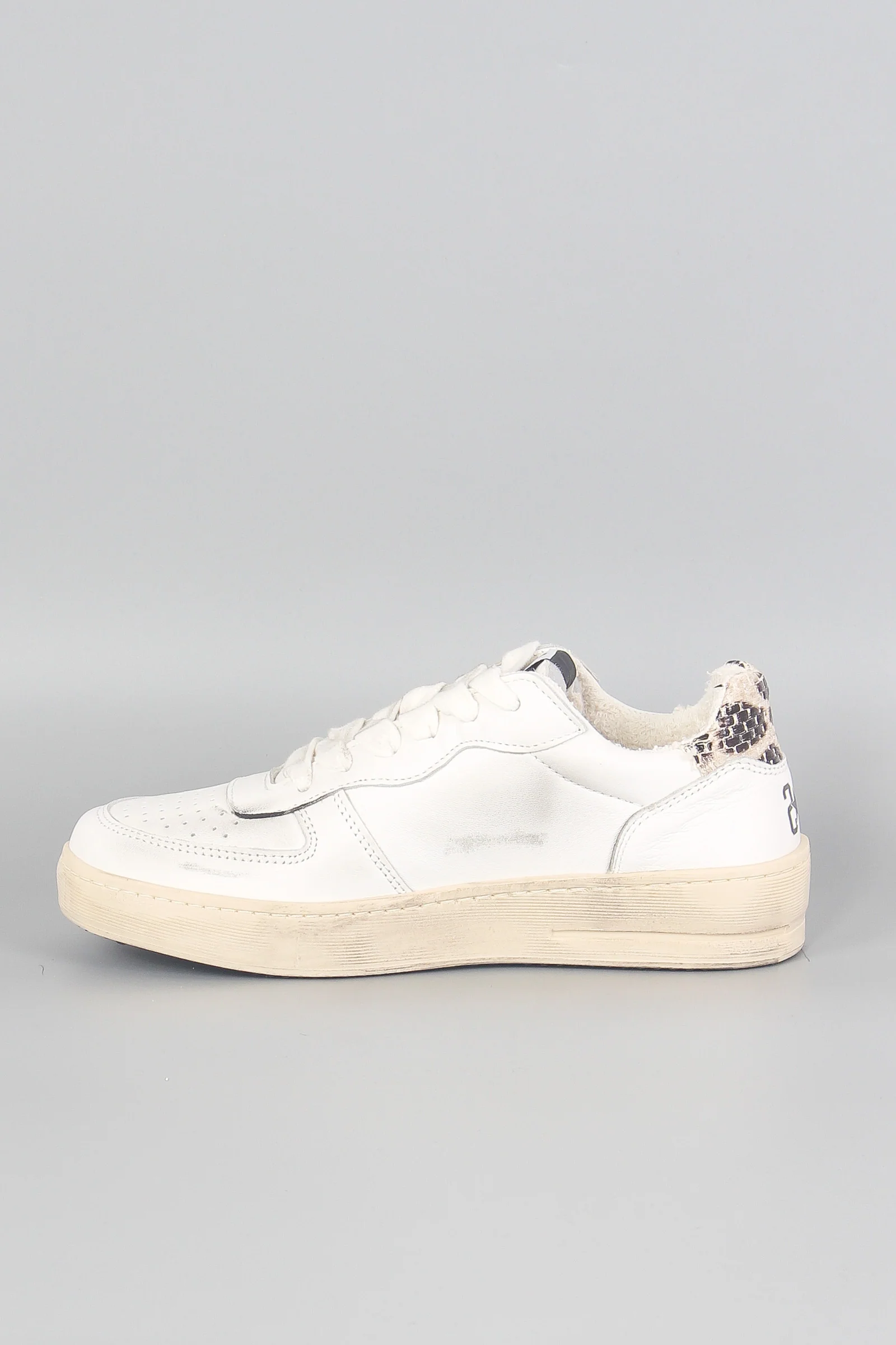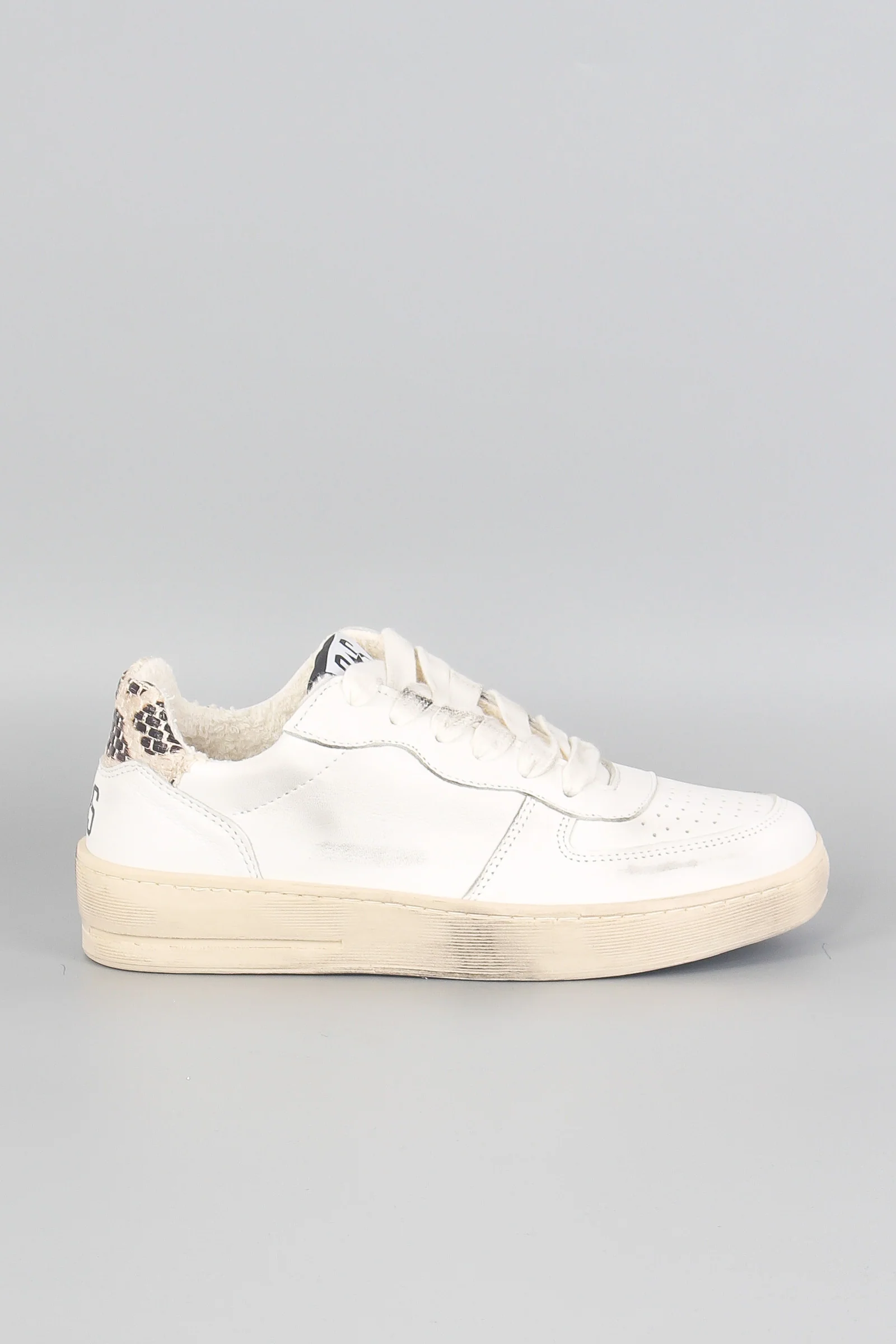 Materiale: Fodera 100% Cotone Tomaia in morbida pelle bovina Sottopiede base in poliuretano rivestito con pelle scamosciata bovina Suola 100% PVC Dettagli: sneaker bianca con suola effetto sporco. Doppio laccio. Logo su soletta e sul retro. Interno peloso.