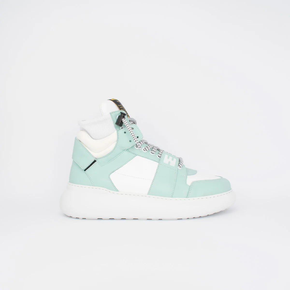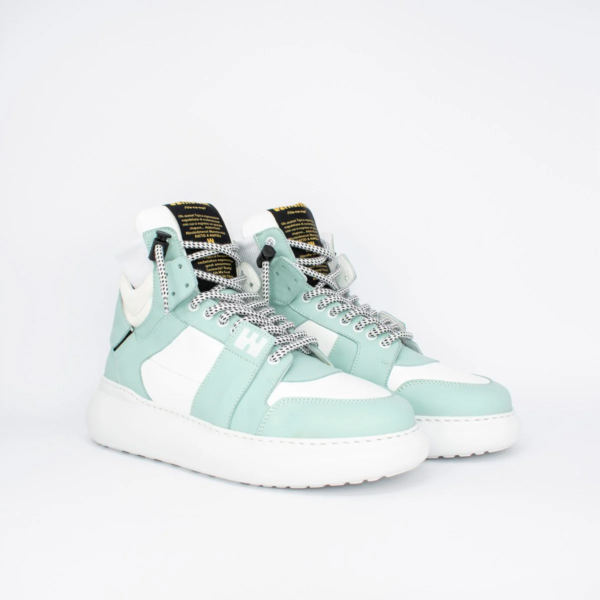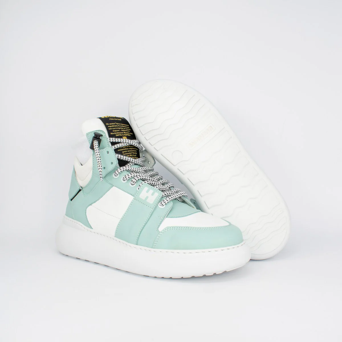 BBOY Mela e Bianco – Linea Bubble Sneakers da uomo in pelle bianca e verde acqua, con suola bounce in leggerissima gomma espansa. Lacci bicolor con sistema Swipe-Up. Cavigliera in maglina elastica. Plantare serigrafato. Made in Italy, anzi… Fatto a Napoli.