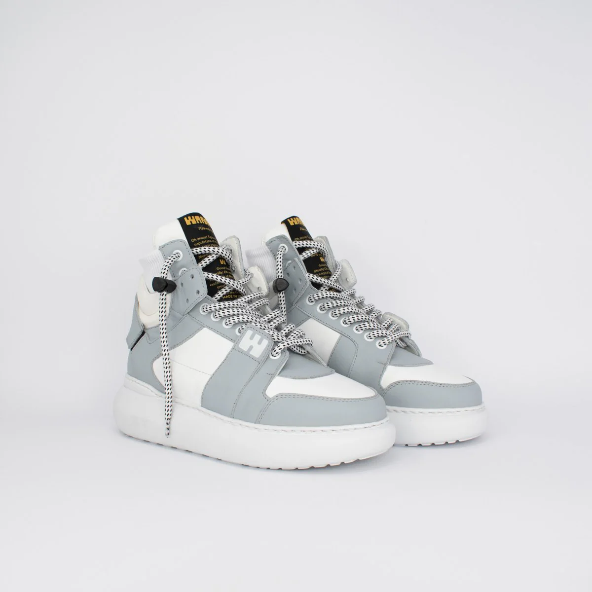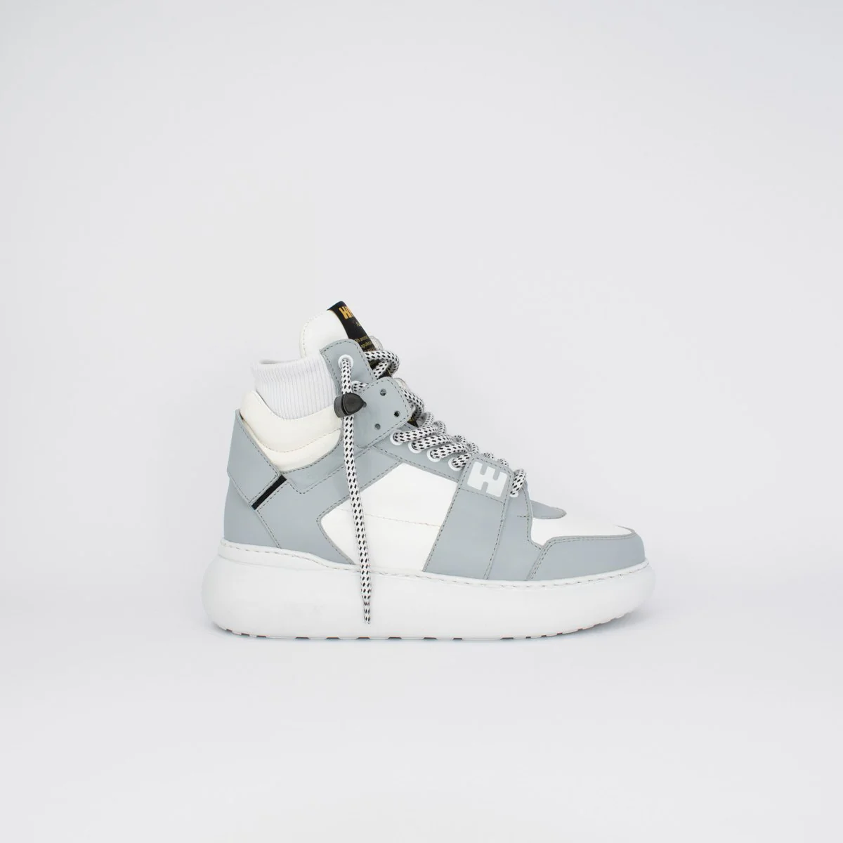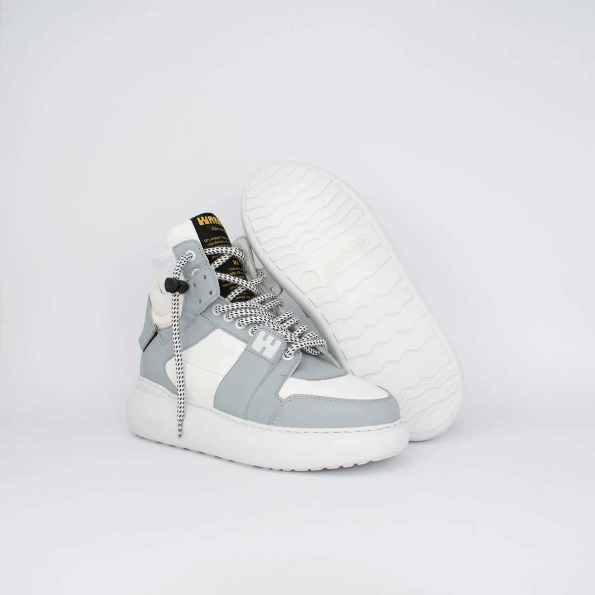 BGIRL Polvere e Bianco – Linea Bubble Sneakers da donna in pelle bianca e grigio chiaro, con suola bounce in leggerissima gomma espansa. Lacci bicolor con sistema Swipe-Up. Cavigliera in maglina elastica. Plantare serigrafato. Made in Italy, anzi… Fatto a Napoli.