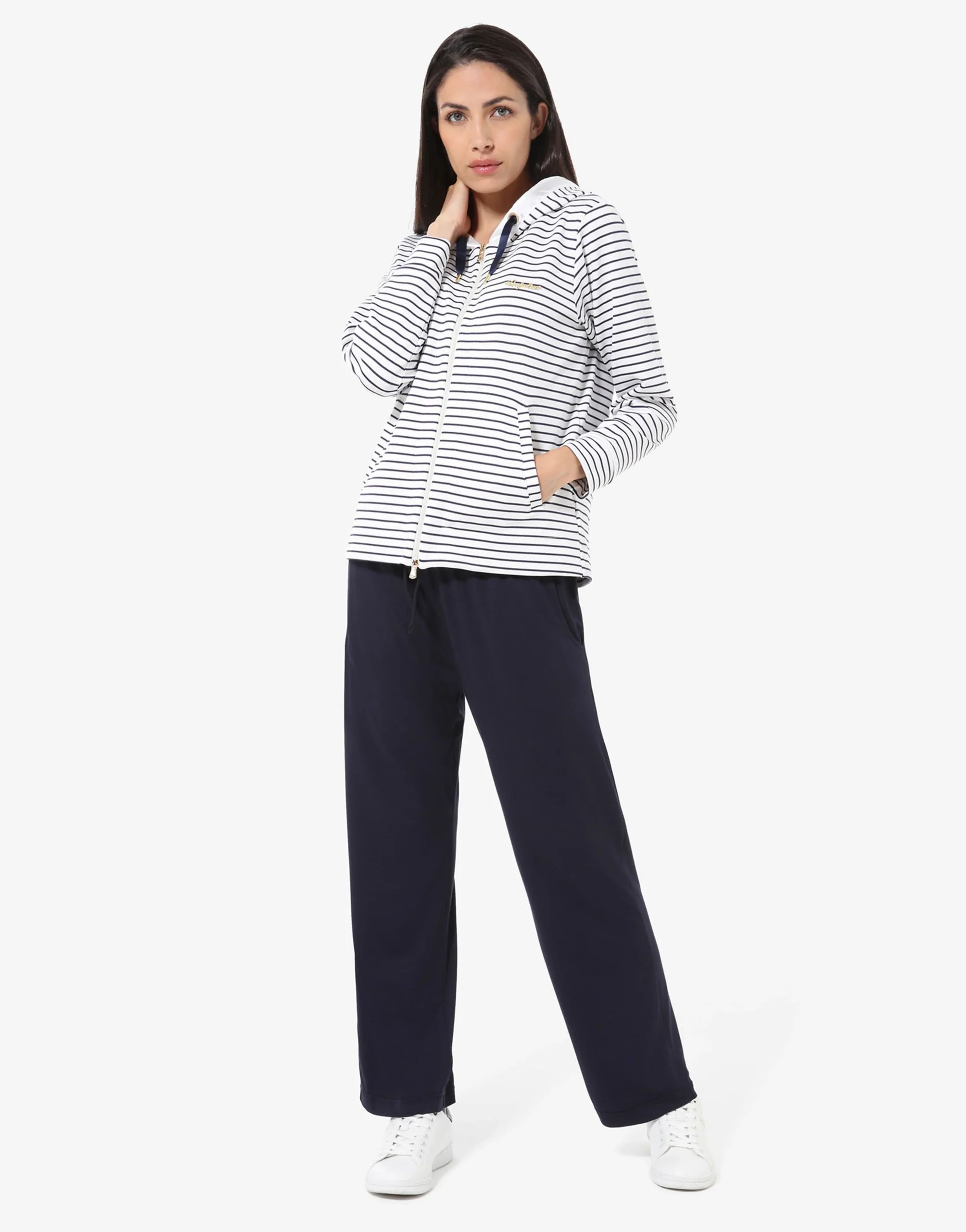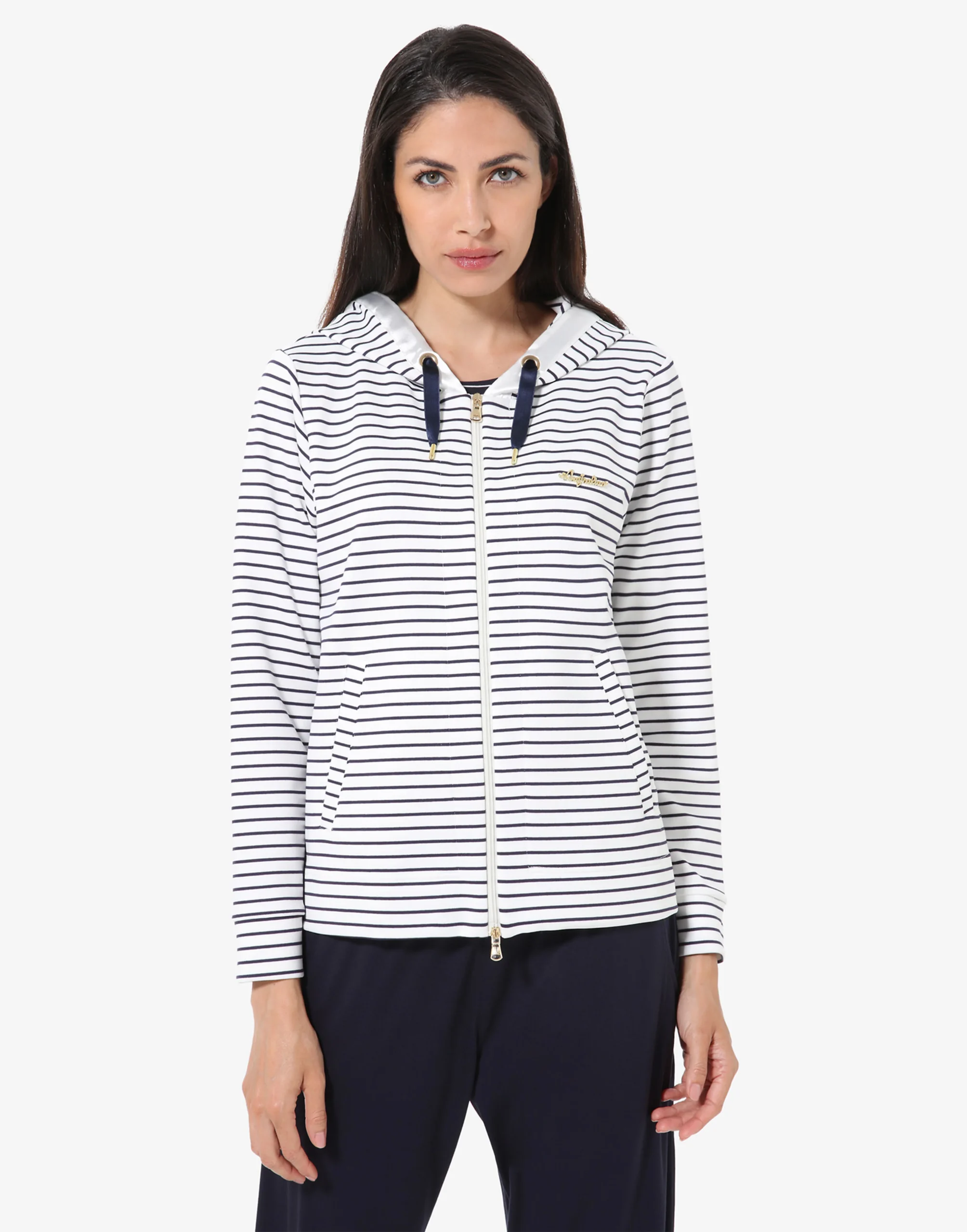 Tuta in poliviscosa e jerseyGiacca:– Interlock rigato viscosa– Zip doppio cursore tiretti oro– Cappuccio bordato in raso– Coulisse in raso– Anelli passanti oro– Tasche no zip– Placchetta oro applicata sul pettoPantalone:– Jersey viscosa– Vestibilita’ morbida– Fondo dritto – Coulisse in vita regolabile – Logo ricamatoMade in Italy