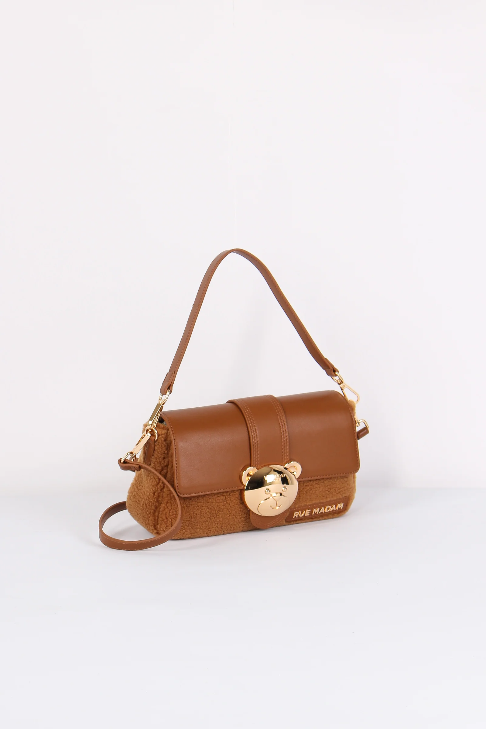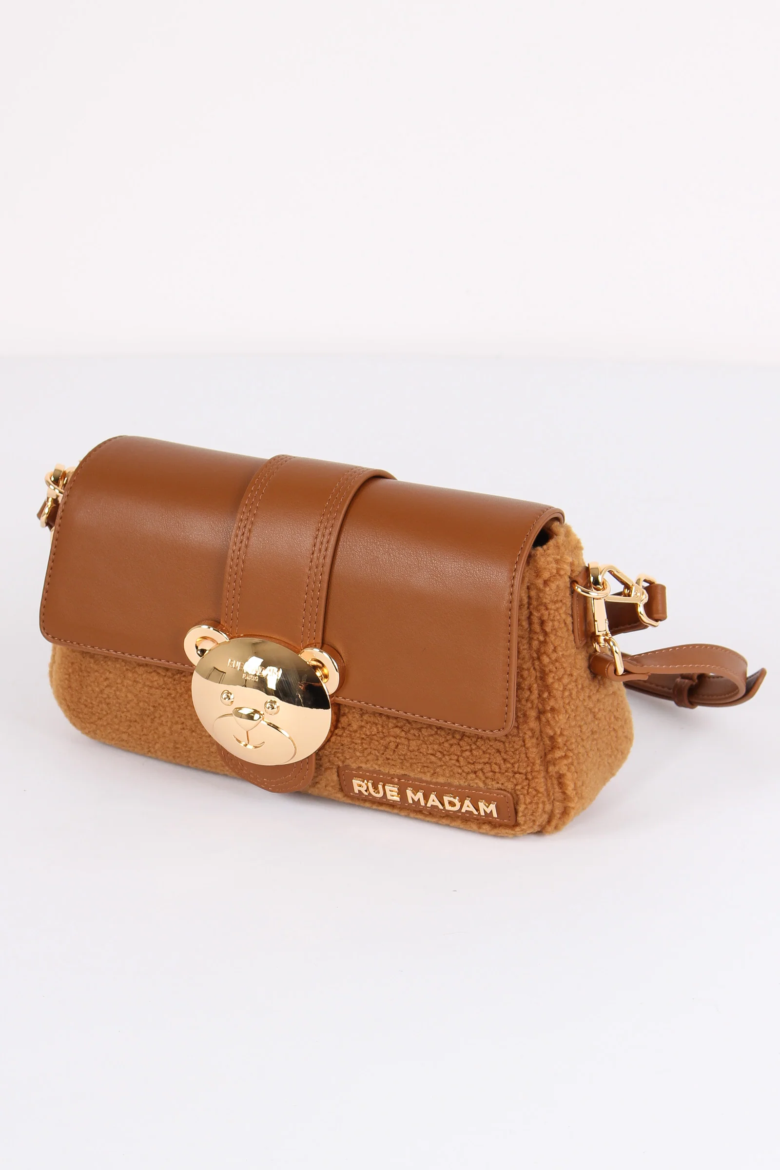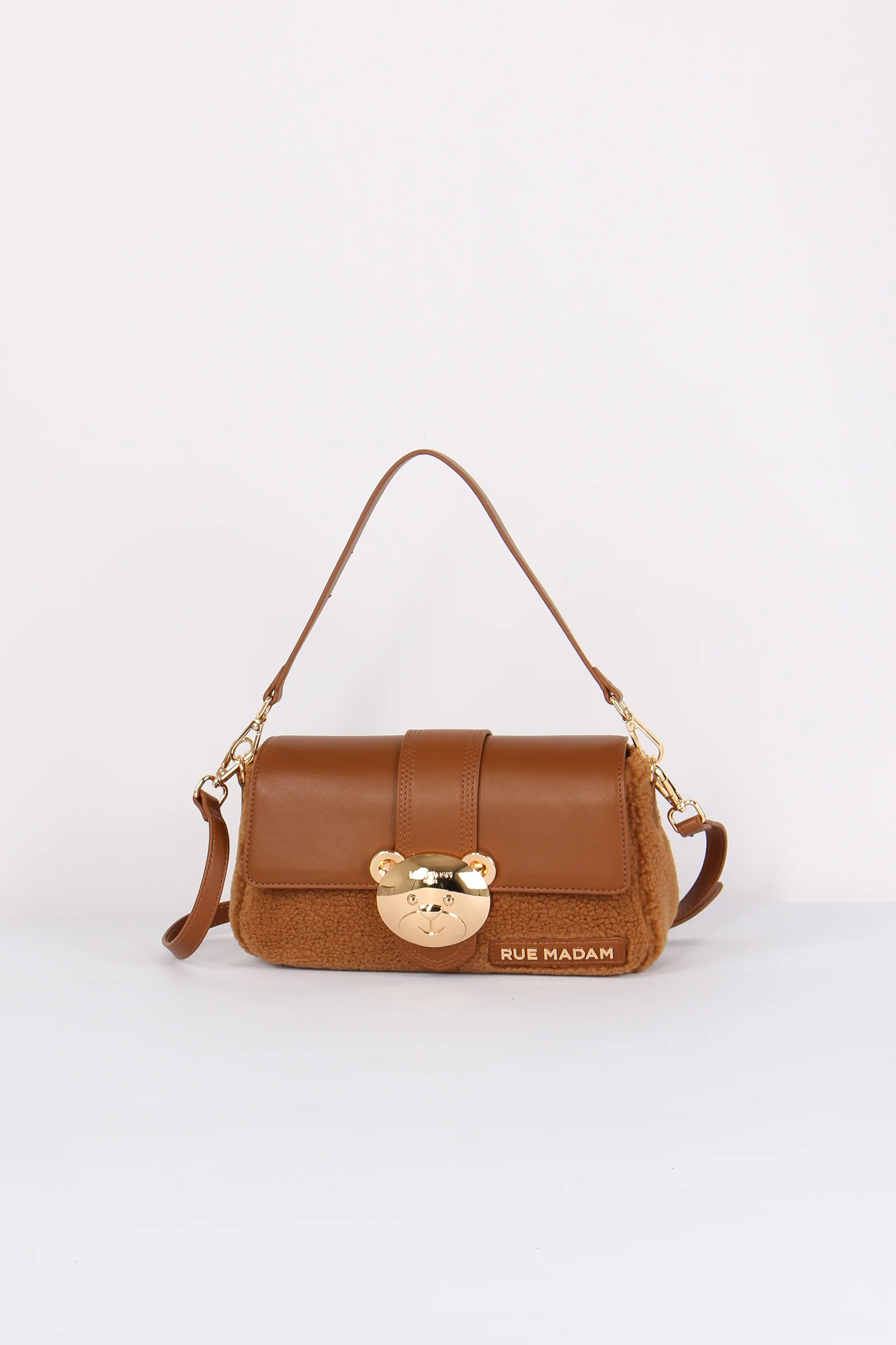 Materiale: ecopelle e ecopelliccia chiusura: rocchetto tracolla: si dettagli: Tracolla bimateriale ecopelle ed ecopelliccia. Logo in ecopelle e chiusura in metallo a forma di orsetto. Manici sia per portarla a mano o spalla che a tracolla removibile e regolabili. Interno con scomparto e zip.