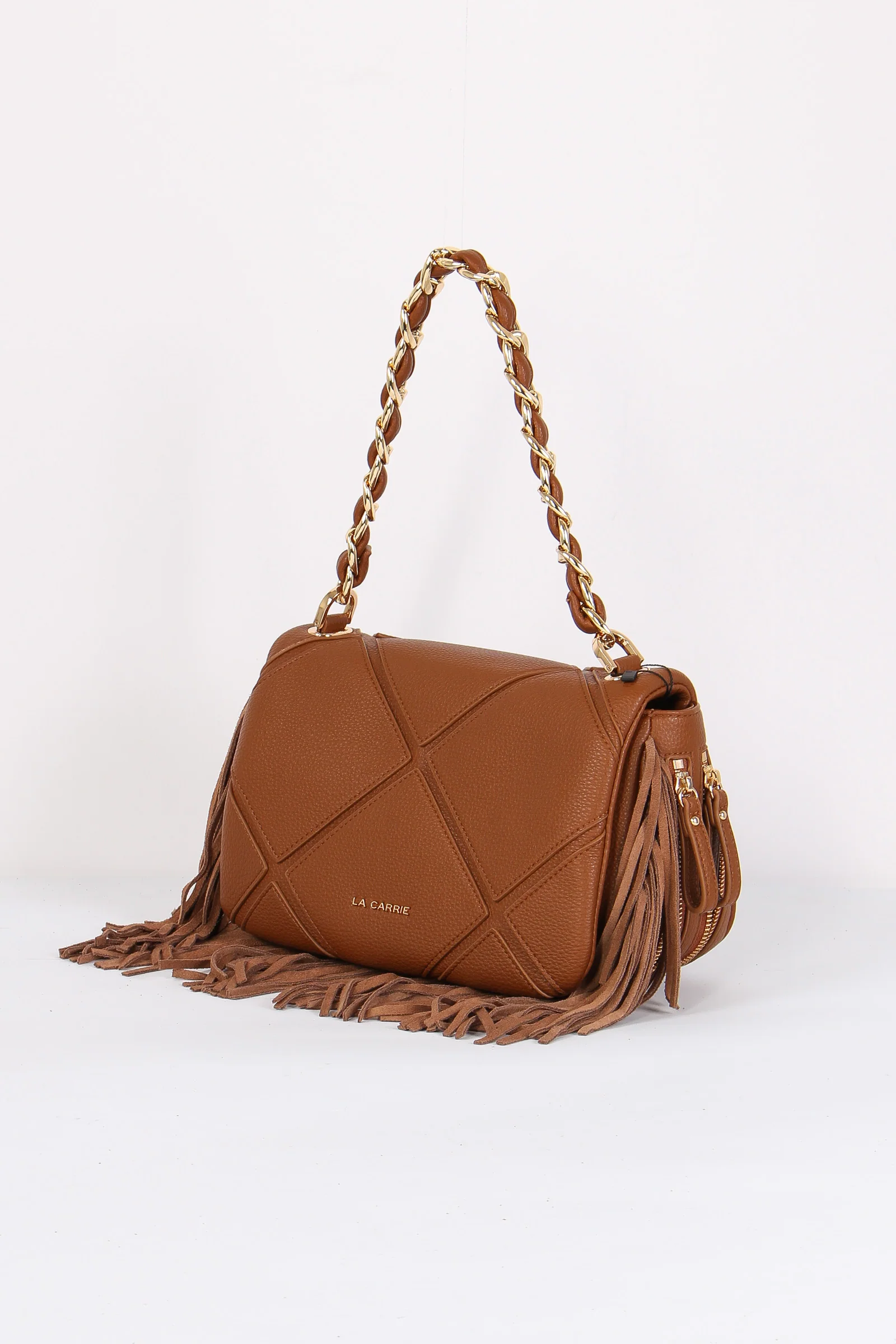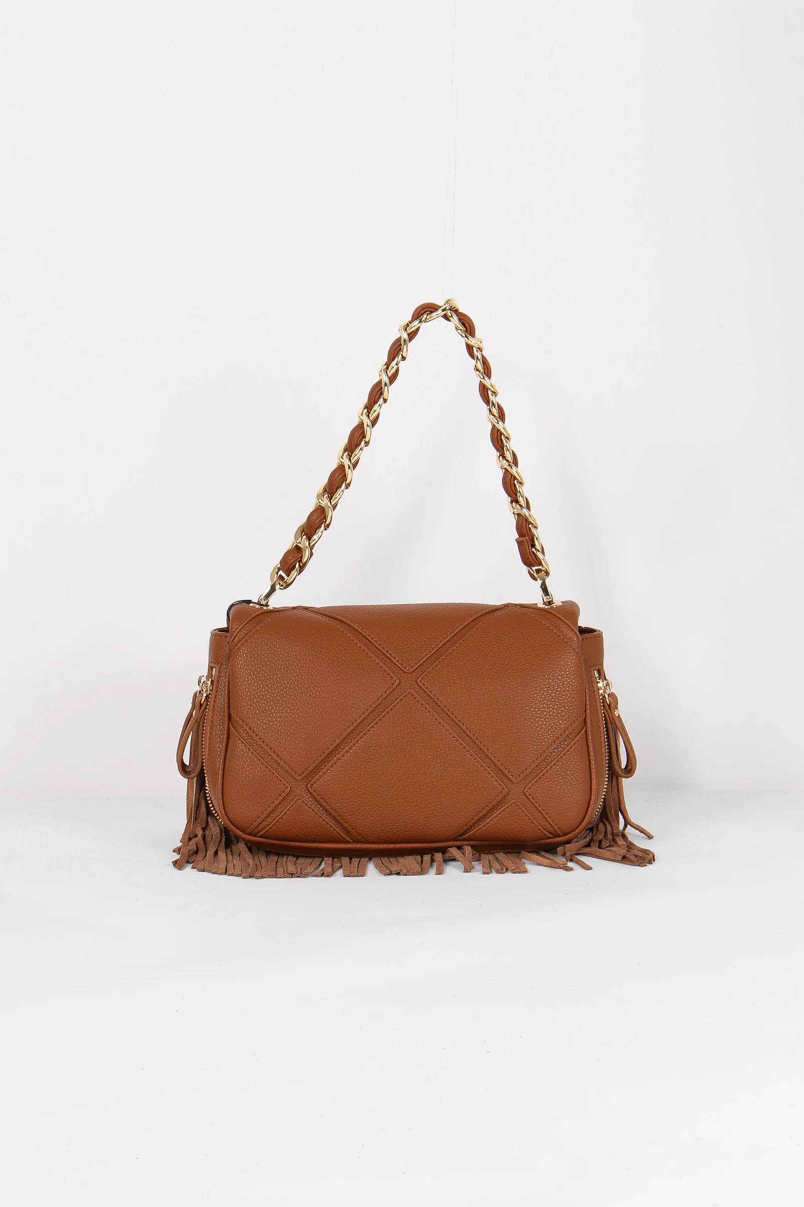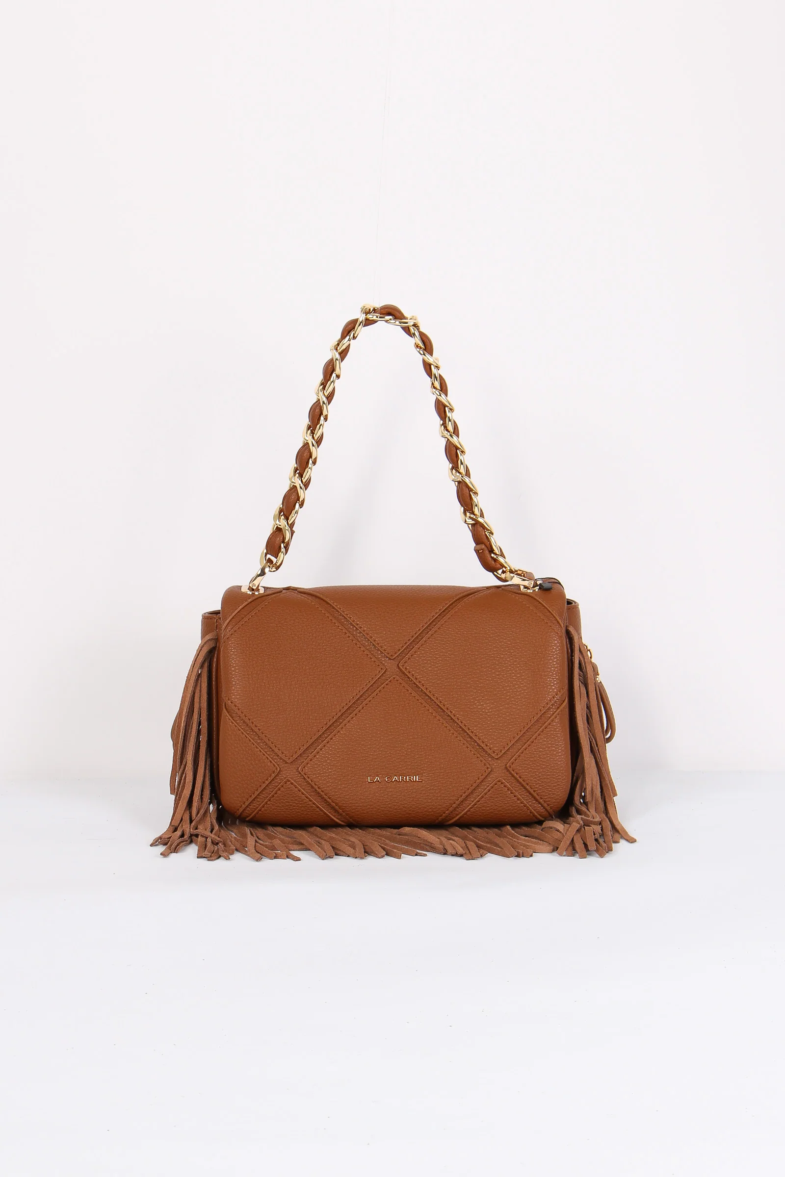Materiale: ecopelle chiusura: patta tracolla: si dettagli: Tracolla in ecopelle trama trapuntata charm frange logato. Bordo inferiore e lati con frange morbide. Manico in catena ed ecopelle tracolla regolabile e removibile. Interno foderato. Misure: altezza 19cm lunghezza 32cm profondità 16