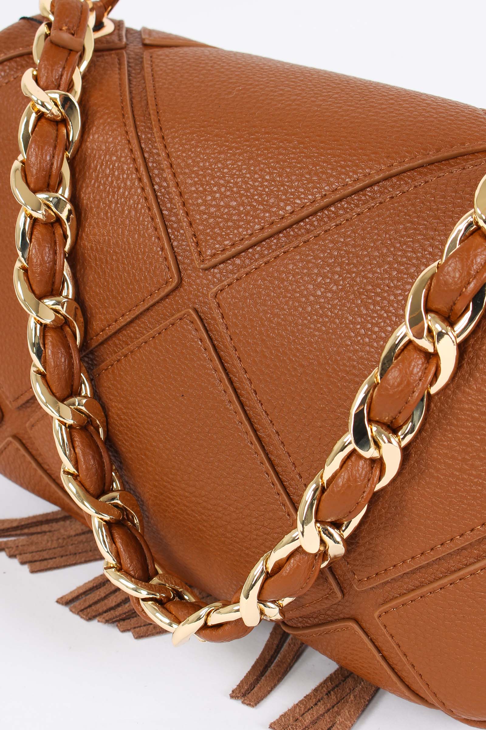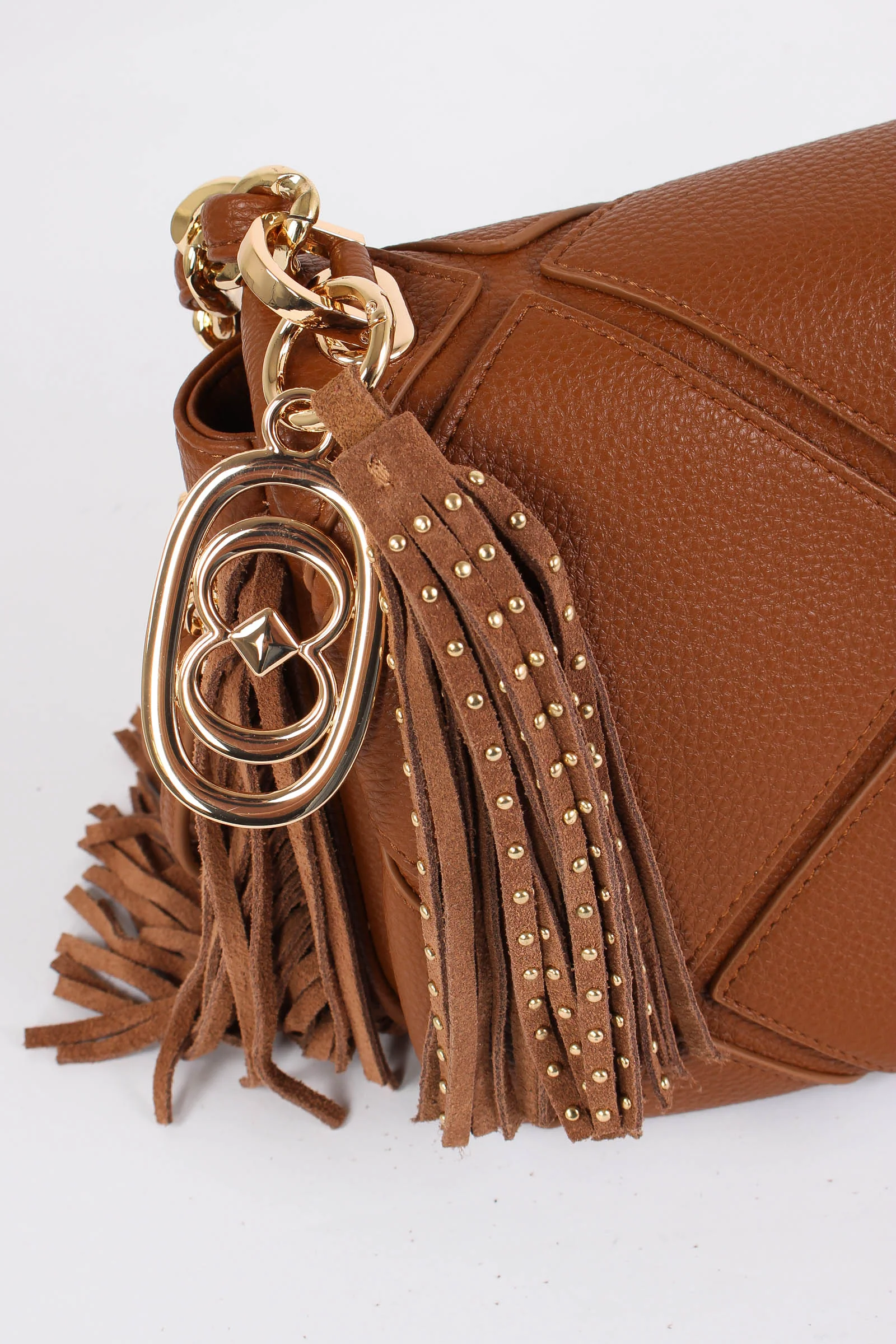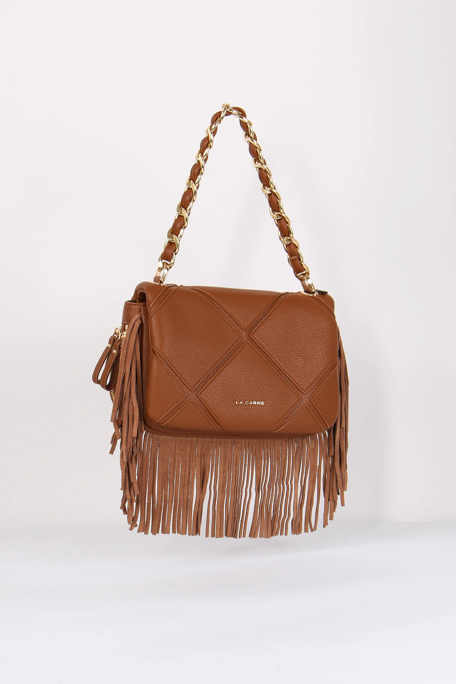 Materiale: ecopelle chiusura: patta tracolla: si dettagli: Tracolla in ecopelle trama trapuntata charm frange logato. Bordo inferiore e lati con frange morbide. Manico in catena ed ecopelle tracolla regolabile e removibile. Interno foderato. Misure: altezza 19cm lunghezza 32cm profondità 16